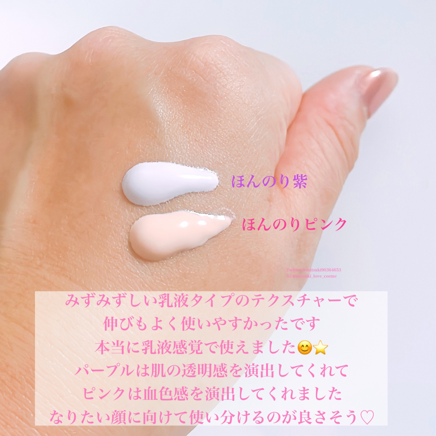 - <ピンク> 水、酸化チタン、ペンチレングリコール、BG、グリセリン、ヒアルロン酸Na、加水分解ヒアルロン酸、キサンタンガム、スクワラン、トコフェロール、アロエベラ葉エキス、ホホバ種子油、アルミナ、ステアリン酸、アジピン酸ジブチル、プロパンジオール、カプリリルグリコール、ポリヒドロキシステアリン酸、ヒドロキシプロピルメチルセルロースステアロキシエーテル、炭酸ジカプリリル、エチルヘキシルグリセリン、ツボクサエキス、ドクダミエキス、スベリヒユエキス、トリエトキシカプリリルシラン、アオモジ果実油、クエン酸、カプリル酸グリセリル、ロドデンドロンフェルギネウムエキス、1,2-ヘキサンジオール、アラントイン、ステアリン酸スクロース、オレンジ油、(アクリロイルジメチルタウリンアンモニウム/VP)コポリマー、ダマスクバラ花水、ナイアシンアミド、ラウリルカルバミン酸イヌリン、マンダリンオレンジ果皮油、(カプリル酸/カプリン酸)ヤシアルキル、リン酸2Na、リモネン、リナロール、シトラール、シラカンバ樹液、メチルプロパンジオール、アデノシン、ジエチルアミノヒドロキシベンゾイル安息香酸ヘキシル、ヤマザクラ花エキス、ビオサッカリドガム-1、t-ブタノール、ポリアクリレートクロスポリマー-6、ポリシリコーン-15、モモ果実エキス、ツベルマグナツムエキス、エチルヘキシルトリアゾン、ヤナギラン花/葉/茎エキス、(VP/エイコセン)コポリマー、カプリン酸ポリグリセリル-2、モモ花エキス、サリチル酸ブチルオクチル、ポリエーテル-1、酸化鉄(CI 77492)、酸化鉄(CI 77491)