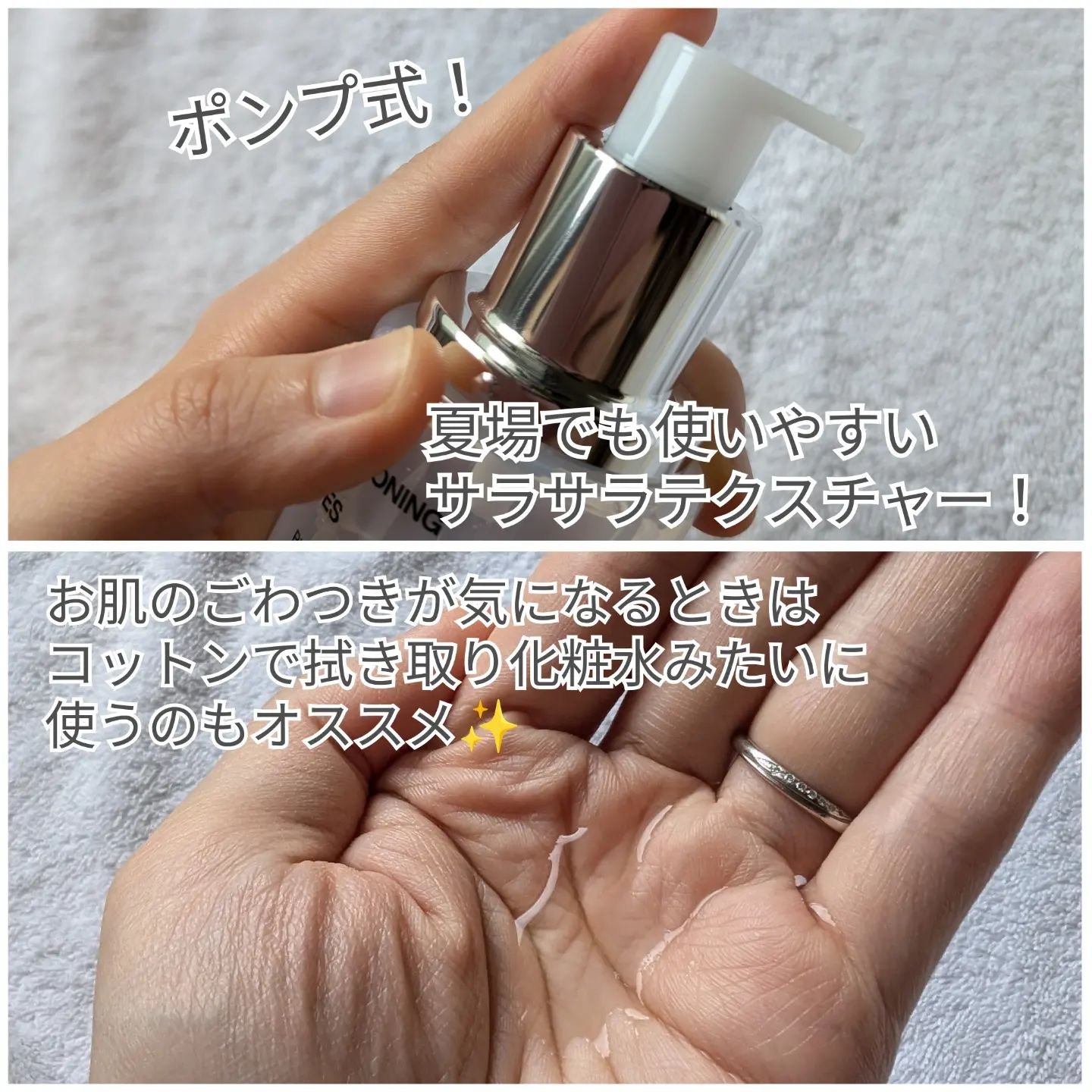 | 出した時はとろっとするのに 肌にのせると ぱしゃっとはじけるように すごくみずみずしく感じるの😇 | 詳細を見る | ||