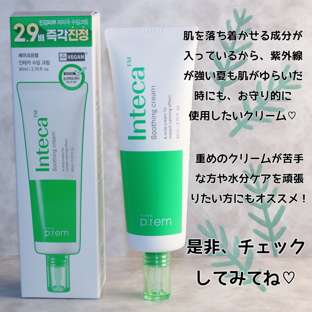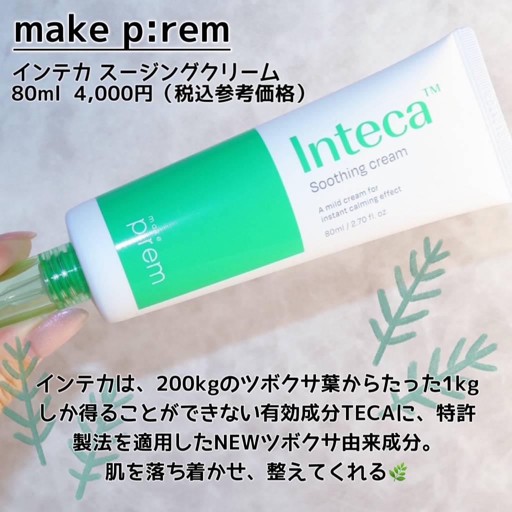 - 整肌効果を期待できるインテカスージングクリーム。独自製法をプラスして安定化したナノサイズのメイクプレムインテカ(INTECA)*を配合し、ツボクサの整肌成分を肌にたっぷりと浸透**させます。潤いたっぷりスージングテクスチャーで速やかに肌を整肌。 *整肌成分 **角質層まで 2025年10月11日(土)より全国のロフト*¹、PLAZA*¹、ハンズ*¹にて発売開始 *¹一部お取り扱いのない店舗がございます。
