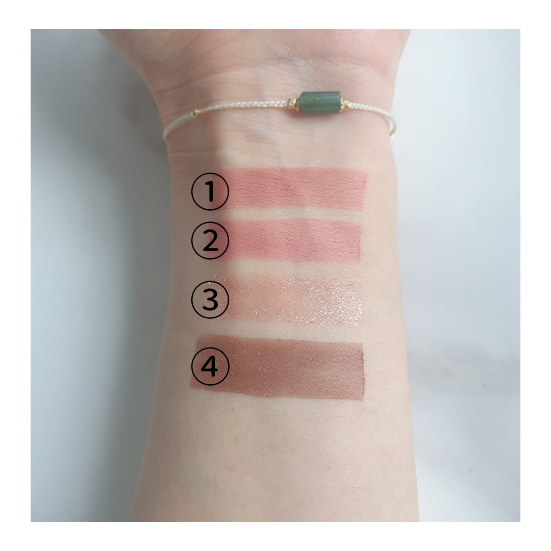 ツヤと血色感、両方手に入る欲張りチーク✨ 粘度が低い液体で、サッと滑らせるだけでも綺麗につきます(スウォッチは指で3回伸ばした) 指で伸ばしてから境目をぽんぽんするだけでも良いですが、スポンジで丁寧に馴染ませるとより自然な仕上がりに✨ スウォッチはピーチピンク&ゴールデンシマーのゴールドパールが目立ちますが、少量頬につけて馴染ませると意外とキラキラした感じがなくて艶に見えます👀 ブルベなので、ソフトライラック1本だけでも良かったんですが、青みが少ないアイメイクをする時はモーヴピンクを使うことも ピーチピンク&ゴールデンシマーはゴールドパールが入っているのでマットのアイシャドウとの相性はちょっと微妙、下2色はどんな質感のアイシャドウとも相性が良いかと思います このリキッドチークは色展開も豊富で購入する時迷いましたが(3/12現在で9色)、モーヴピンクかソフトライラックが失敗が少ないかもしれません