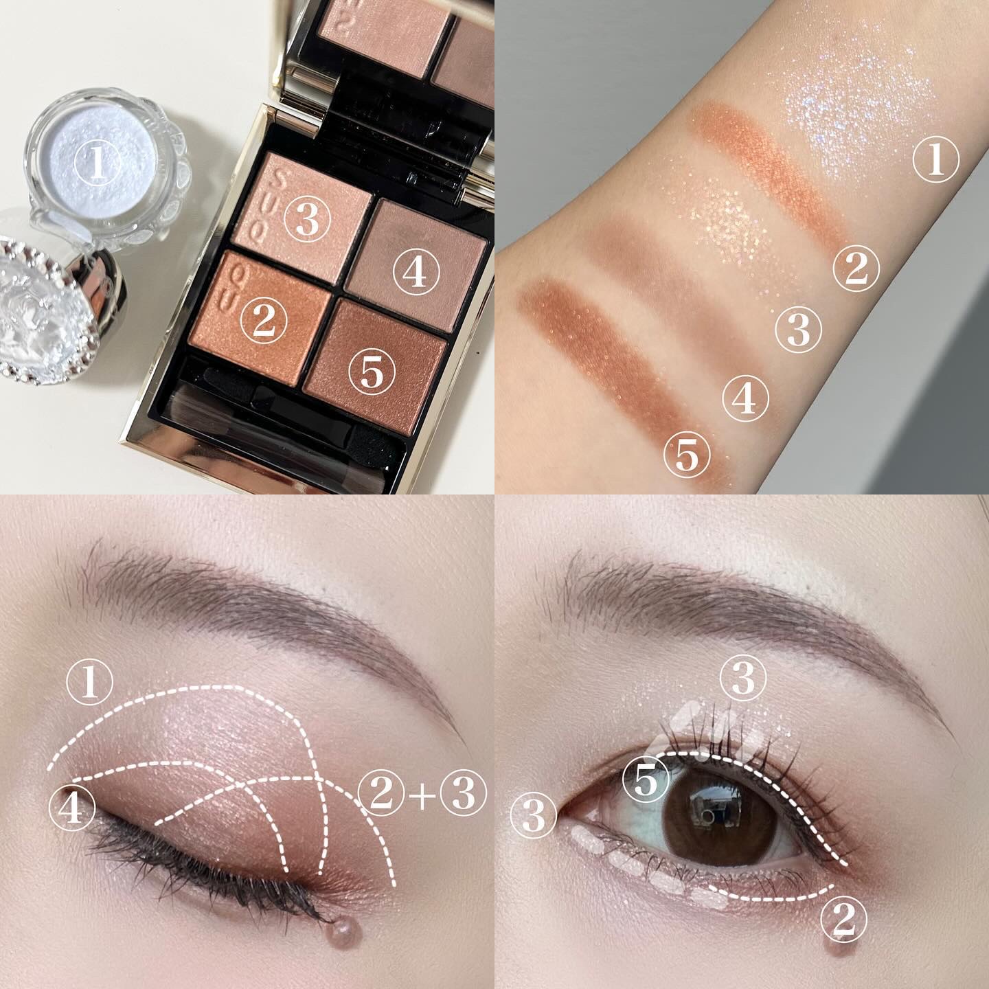 実物すごくキラキラで美しいです。 SUQQUって鮮やかな色展開のものが多いから新鮮🤍 左下のブラウンラメはザラザラ系のラメでわたしのまぶたと相性が良くなくて目の際とか少しヨレやすいかな? 普段あまり使わない色合いなので、メイクがイマイチですが、、、 実物本当に美しくてテンション上がるのでご安心を😂