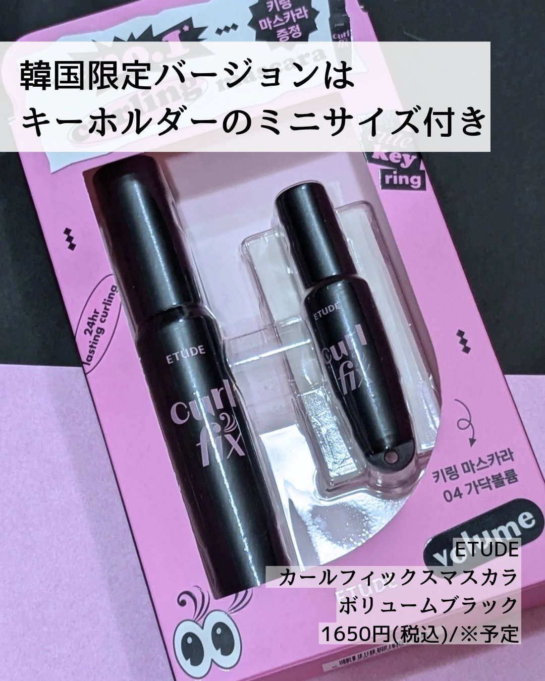 大人気のエチュードのカールフィックスマスカラから、待望のボリュームタイプが新発売♡ 既存のカールフィックスマスカラは真っ直ぐで細かく密集したスリムブラシになっています。 カールキープ力が素晴らしい🥹🩷🩷 朝メイクし、夜に鏡を見た時にまつ毛のカールが残っていて感動! 新作はピンクパケのものよりもボリューム感が出るので目力がアップして嬉しい🤍 私はボリューム感も欲しいので、特に新作を推します🖤