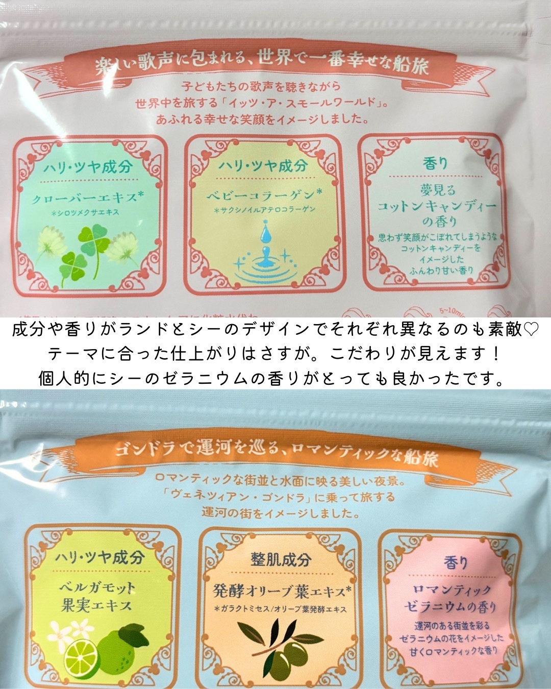 東京ディズニーリゾート限定 デザインフェイスパック 夢みるコットンキャンディーの香り ロマンティックゼラニウムの香り 各7枚入り2袋 ¥2,600(税込) ルルルンのパックの使い心地などはそのままに香りやパッケージデザインがディズニーリゾート限定なの♡ デザインも可愛くてパックしながらディズニーいるみたいに気分も上がっちゃう♡