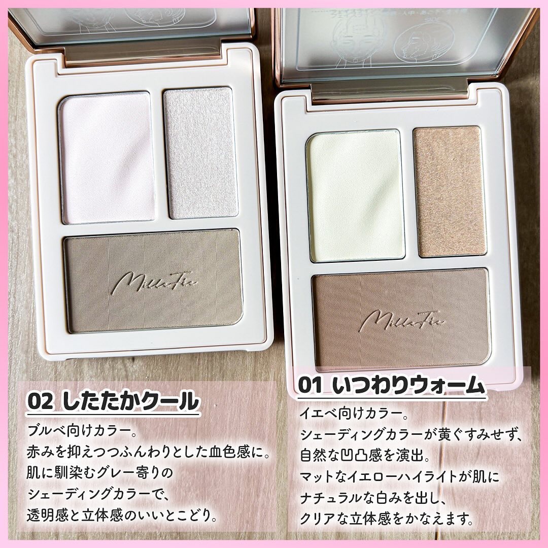 - マット質感でナチュラルボーンな輪郭演出!これぞ「#チート顔」 2色のハイライトが1つのパレットに入っており、用途によって使い分けが可能です。より高さを出したい、強調したいというところにはつやタイプのハイライトを、ナチュラルに輪郭補正したいところやテカリを抑えつつ肌に凹凸を出したいところにはマットハイライトを乗せる使い分けがおすすめです。 イエベ・ブルベ別のカラー展開 本製品は「01 いつわりウォーム」がイエベ向け、「02 したたかクール」がブルベ向けの2色展開となっております。ハイライトカラーもパーソナルカラーに基づいて調整された色味のため、自然で可愛い輪郭を演出します。 スマートなフォルムで持ち運びにも 3色も入って鏡付きなのに薄くスマートな設計のため、持ち運びに適しています。自宅でのメイクにも、出先でのメイク直しにも使える便利なアイテムです。 2024年6月17日よりQoo10、楽天市場店、Yahoo!ショッピングで販売を開始予定 店頭では7月上旬より全国のロフトおよびロフトネットストア、ハンズおよびハンズネット、アインズ&トルペ、@cosme STOREにて順次先行販売を開始予定(いずれも一部店舗を除く)