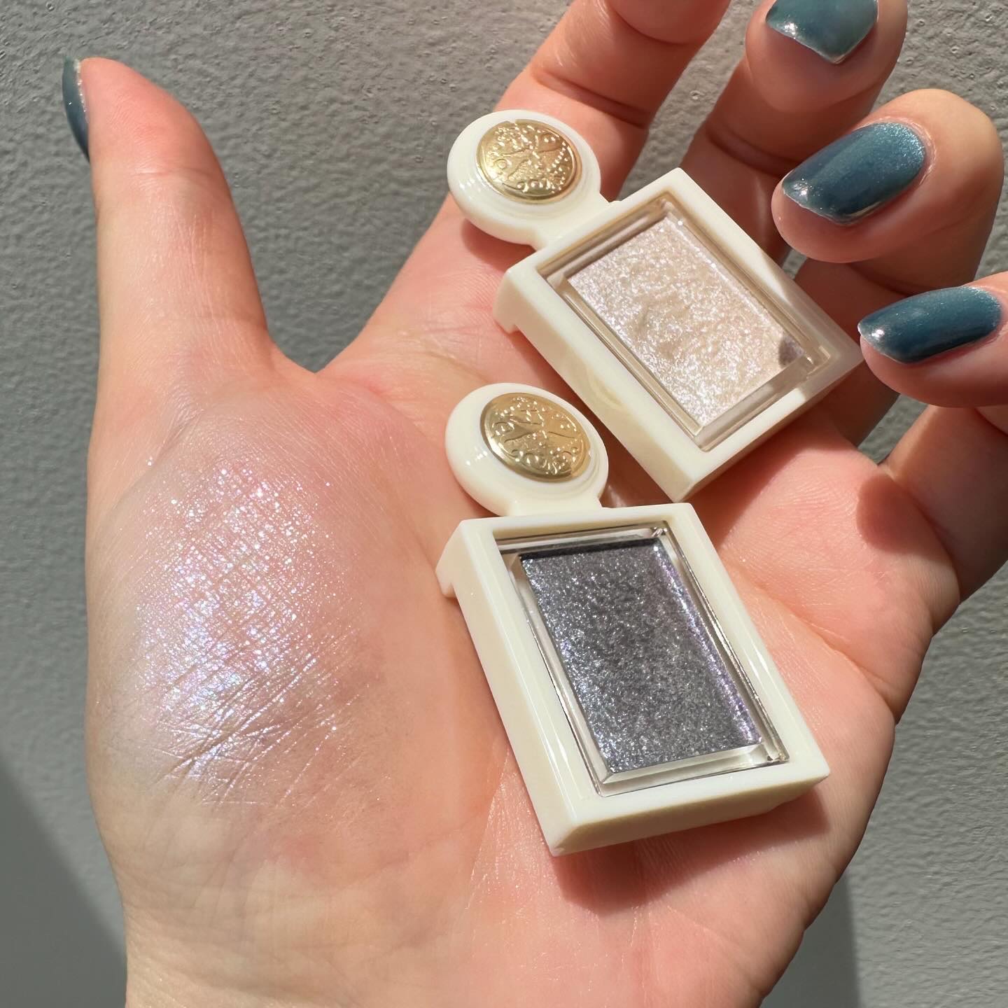 手に試した感じではベースのブルーは弱く、ラメ自体がブルーで可愛すぎる…! BAさんはパウダーアイシャドウのベースにもおすすめと教えてくれたので、 今日はこちらをベースにピンクブラウン系の アイシャドウを使ってメイクしてみたよ🫶🏻 肌に伸ばすとすぐにサラサラになるから ベタベタが残ったりしないし、 パウダーアイシャドウの上に重ねてもヨレない◎
