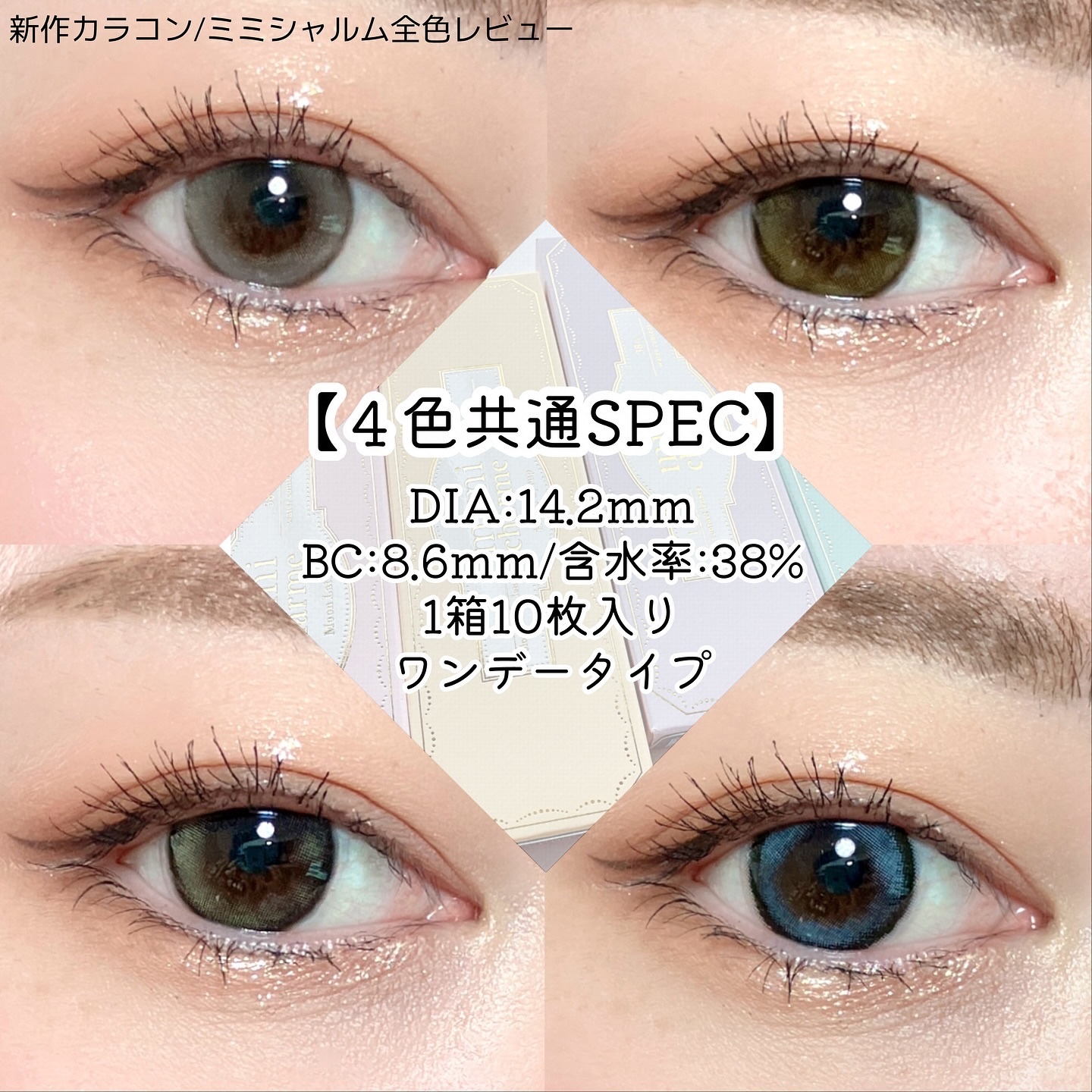 - 誰もが物語の主人公。 舞台の上でスポットライトを浴びているように瞳に魅力と光をまとわせ、毎日のわたしをより一層美しく輝かせる。 mimi charme(ミミシャルム)と一緒に物語の続きを。 <キティパフ> DIA14.2mm/着色直径13.8mm 太フチ無敵盛れ水光グレー あざと子猫ちゃんになれちゃう! 一軍太フチグレーレンズ <ジェムグレージュ> DIA14.2mm/着色直径13.5mm 細フチ大人っぽ水光グレージュ グレーなのにナチュラルでデイリー使いしやすい! <ドーリードロップ> DIA14.2mm/着色直径13.6mm 新感覚♡きゅるん盛れドーリーアイ 散りばめたブルーのハイライトがトレンド感満載! <ハニーシロップ> DIA14.2mm/着色直径13.5mm 細フチあざと水光ブラウン 新王道!垢抜け水光ブラウンレンズ <ムーンラテ> DIA14.2mm/着色直径13.0mm キラめき水光ミルキーベージュ オシャレな放射状ハイライトでまるで発光しているような瞳へ! <ロイヤルムーン> DIA14.2mm/着色直径13.0mm キラめき水光ミルキーグレー あの大人気カラームーンラテの色違い! 儚げうるみグレーレンズ カラーコンタクトレンズの不適正使用による眼障害の危険性等などがあります。 ●コンタクトレンズは高度管理医療機器です。不十分な洗浄・消毒など不適切なケアや、長時間・交換期間を超えた装用により、アレルギー性結膜炎、角膜感染症、角膜潰瘍等の重篤な眼障害が発生する危険性があります ●ご使用前に取扱説明書を確認してください 使用上の留意事項 ●眼科医院等を受診してからお求めください ●眼に異常を感じたら直ちにレンズ使用を中止し、お近くの眼科等で診察を受けてください ●医師の指示にしたがってご使用ください ●コンタクトレンズを装用する場合、自覚症状がなくても、眼科医院等での定期検査を受けてください ●レンズに不具合がある場合は使用しないでください