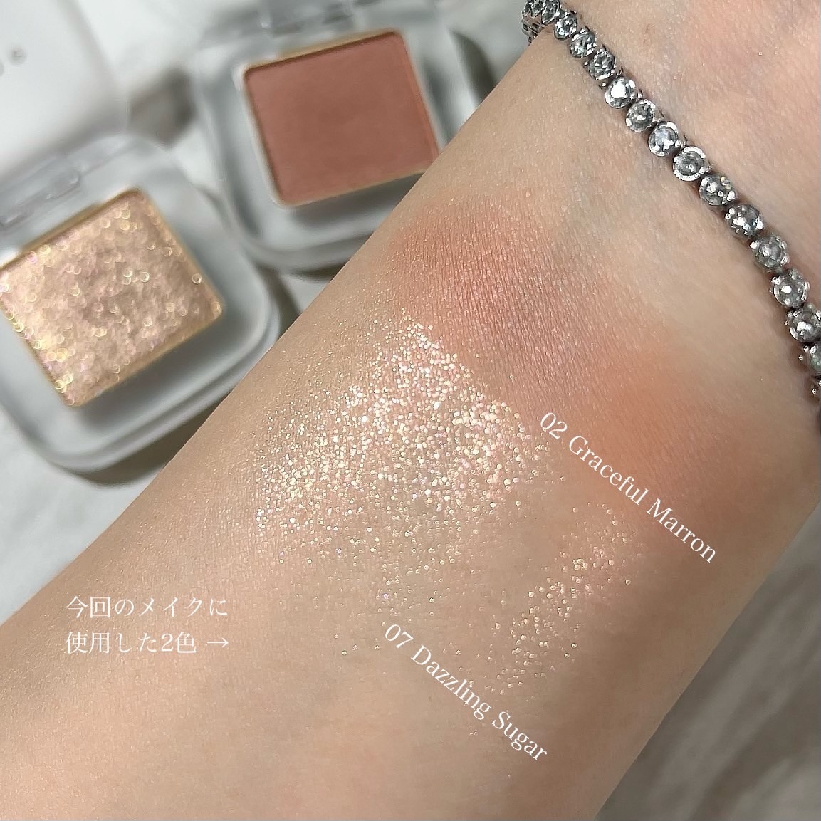 よくパレットのなかで明るいカラーをベースにまぶたに広く塗ることが多いのですが、パール感のあるカラーを避ける🙆♀️! パール感たっぷりの明るいカラーは涙袋に使うぐらい光を集めてぷっくり見せてくれるので、まぶたに広く使うと腫れぼったく見えがち😓 目元を明るくみせてくれたり、次に使うアイシャドウをぼかしやすくしてくれるけど、すっ飛ばしてメインのカラーを塗っちゃう✊🏻❤️🔥 涙袋にはたっぷり塗ってぷっくり見せる🙆♀️💕 シルキースフレアイズのマットタイプはすごく優れているな〜と感じました☺️💗 赤やオレンジなどは、入れすぎると腫れぼったく見えやすいので、見せたいカラーは下まぶた目尻にのせて色をたのしむ♡♡ パール感なしの透けマットだけじゃ物足りない… そう感じさせない華やかなラメが左上に入っているので黒目上と涙袋にのせるとすごく可愛い仕上がりに😍! 厄介な左右差のお陰でマットアイシャドウが好きになりました😌💕