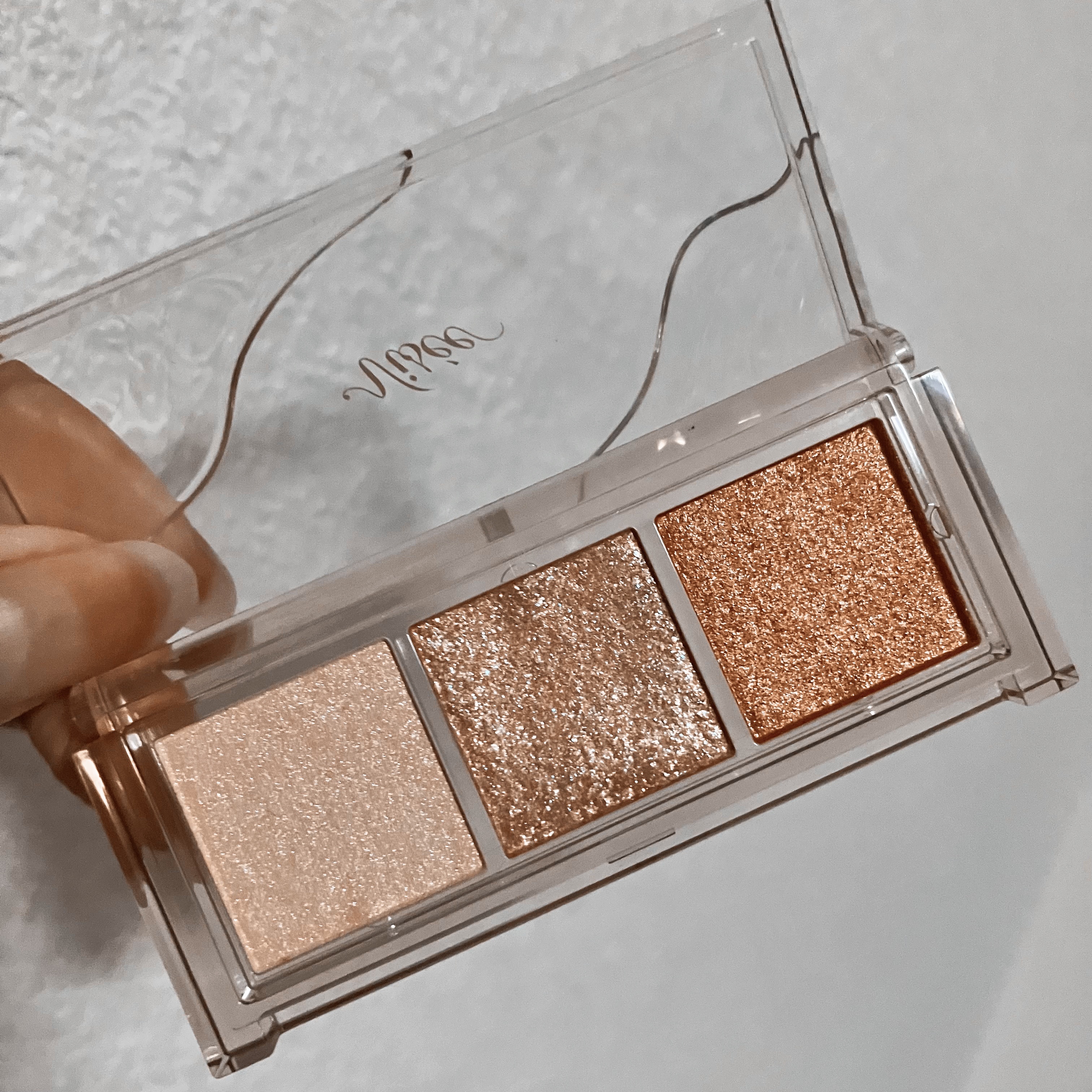 高輝度偏光パール×大粒グリッターを贅沢に配合した3色セットのアイカラー。角度によって色と輝きが変化する偏光パールが目元に魅力的な輝きを与えます! グリッターカラーがすごく可愛くてまぶた全体に塗ってもギラギラし過ぎない💫 パッケージはコンパクトでスリムなデザインでふた部分も水面のような立体感があり美しい💗