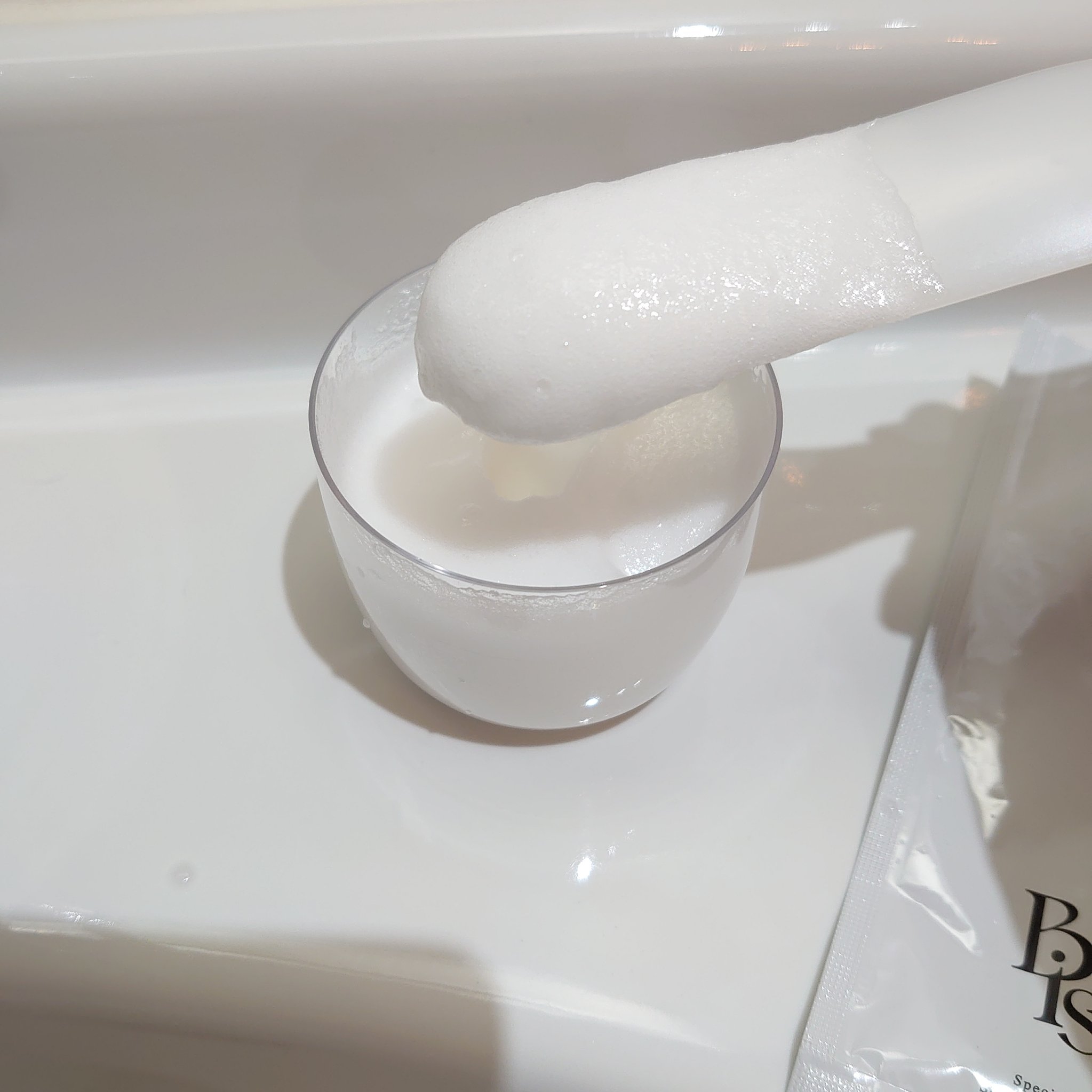 ジェル状の美容液とパウダーを混ぜ合わせて作る炭酸パックです。 15秒ほどすると、モコモコの泡ができて顔に優しくのせていきます。 1回使うだけで肌のキメの細やかさを感じたのとトーンアップもしたのでぜひ使ってみてほしいです👏