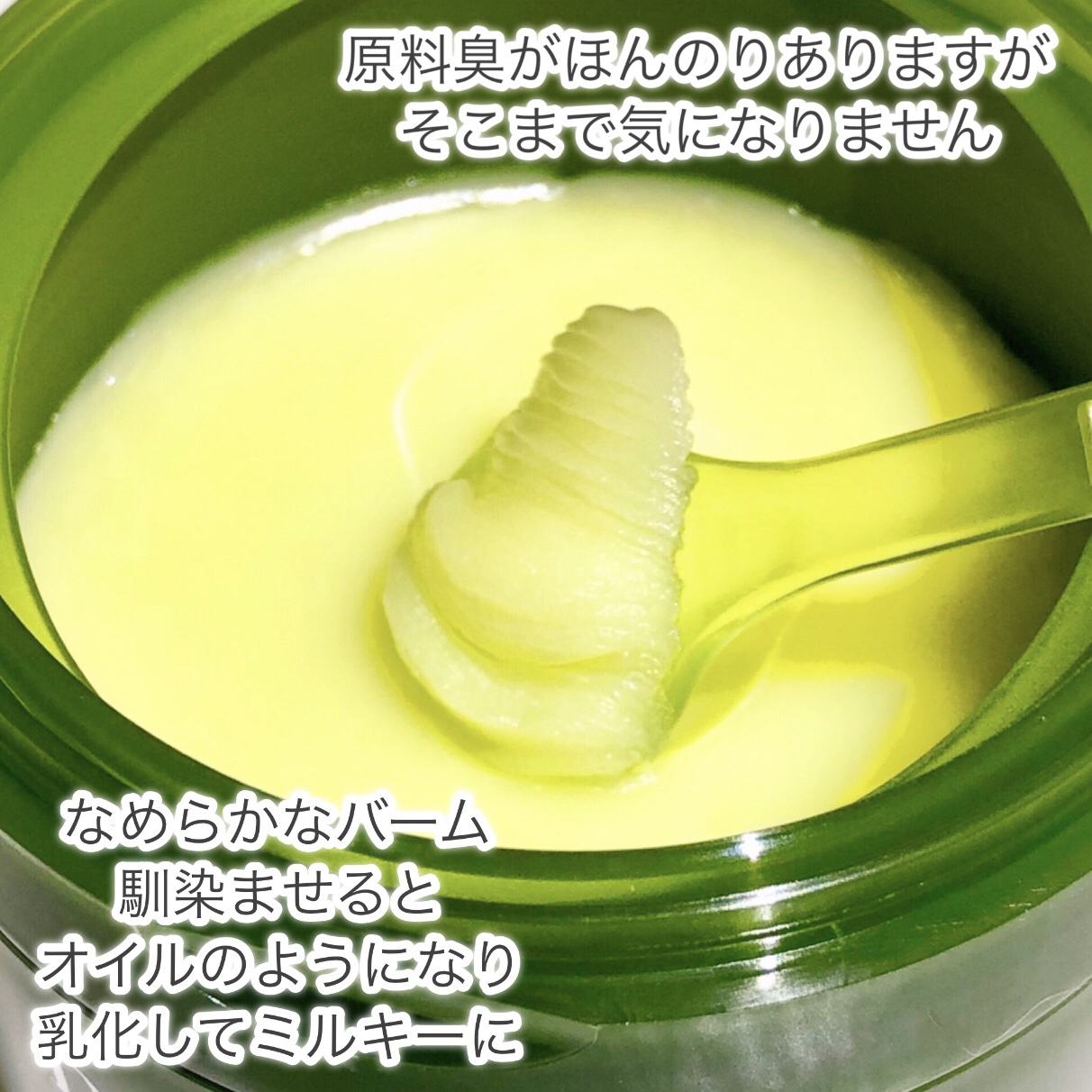 最初はバームでメイクなどの汚れを溶かし、オイルに変わるとブラックヘッドや角質を優しく除去し、最後にミルクに変わりつっぱり感なく仕上がります。 普段からバームタイプのクレンジングを使ってるんだけど、このクレンジングは特につっぱり感のない仕上がりで良かったです🐰💚 落ちにくいアイメイクもしっかり落としてくれるので、クレンジングとしてももちろん優秀◎