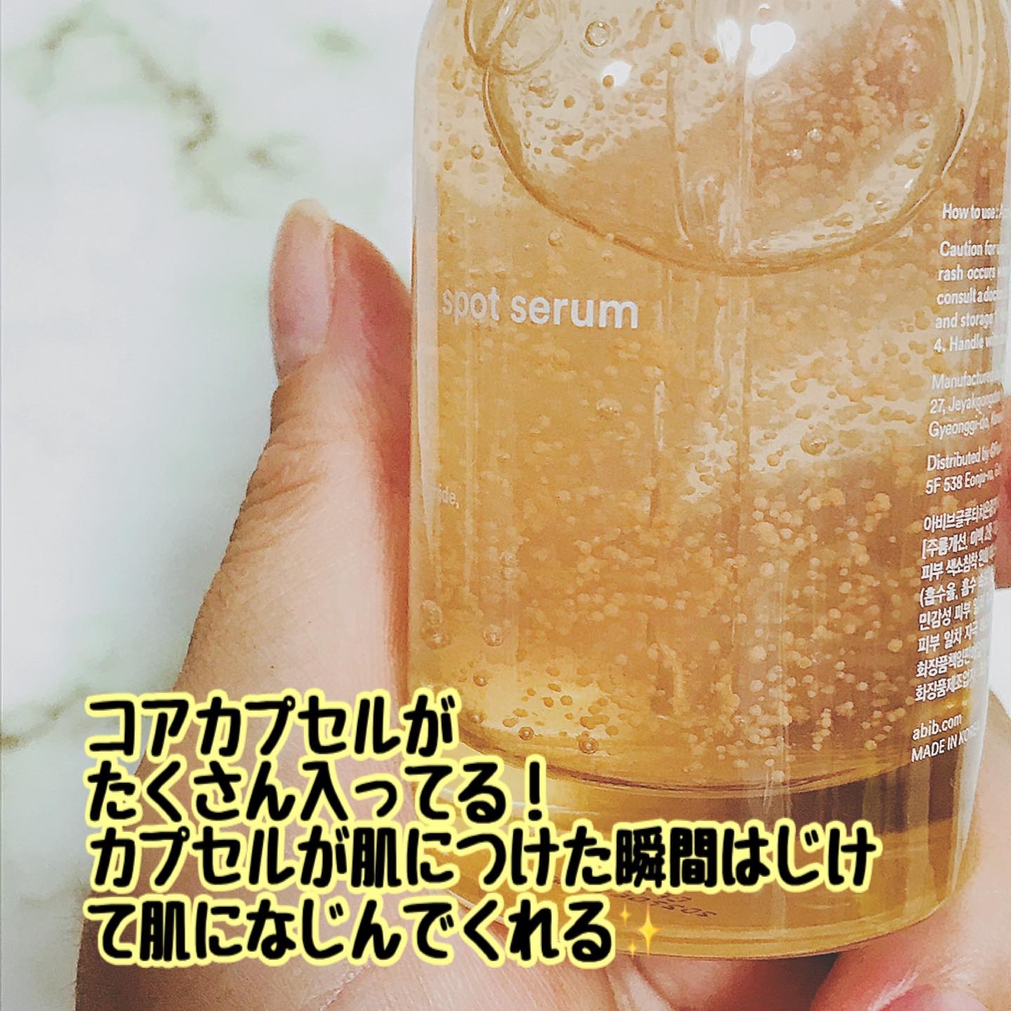 - <アビブ グルタチオンソームダークスポットセラムビタドロップ> 水、BG、ナイアシンアミド、1,2-ヘキサンジオール、コーンスターチ、トチャカエキス、ポリアクリレートクロスポリマー-6、ベタイン、クロレラエキス、グルコース、サトウキビエキス、(アクリレーツ/アクリル酸アルキル(C10-30))クロスポリマー、トロメタミン、アセチルグルコサミン、フルクトオリゴ糖、フルクトース、グリセリン、ペンチレングリコール、エチルヘキシルグリセリン、アラントイン、DPG、アデノシン、グルタチオン、EDTA-2Na、マデカッソシド、カルボマー、ヒドロキシプロピルメチルセルロース、水添レシチン、β-グルカン、コレステロール、酸化鉄、アシアチコシド、ツボクサ葉エキス、キトサン、アスコルビン酸、3-O-エチルアスコルビン酸、アスコルビルグルコシド、セラミドNP、リンゴ果実培養細胞エキス、トコフェロール、フェルラ酸、乳酸