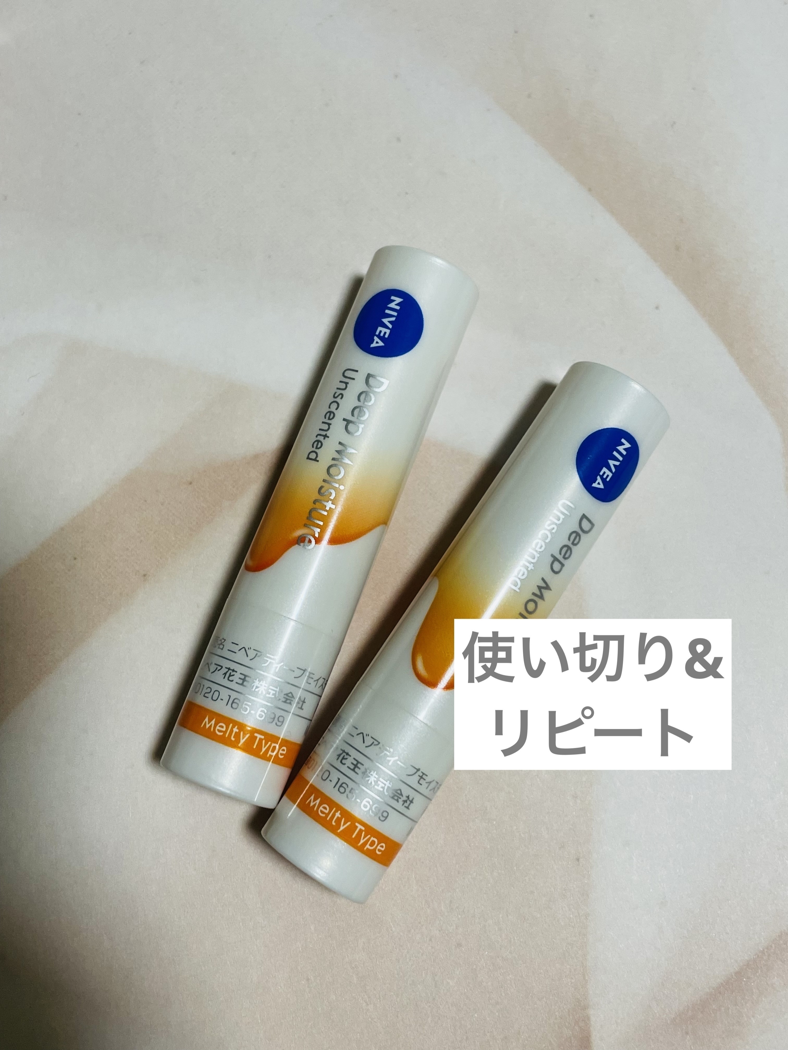 ニベアニベアディープモイスチャーリップメルティタイプバニラ&マカダミアの香り【質感 保湿】ベタつきは感じないサラッしたリップ何も飲んだり食べたりしなければ保湿はキープされてます。タンブラーに入った水をちょこちょこ飲んでで2時間おきにつけ直して...