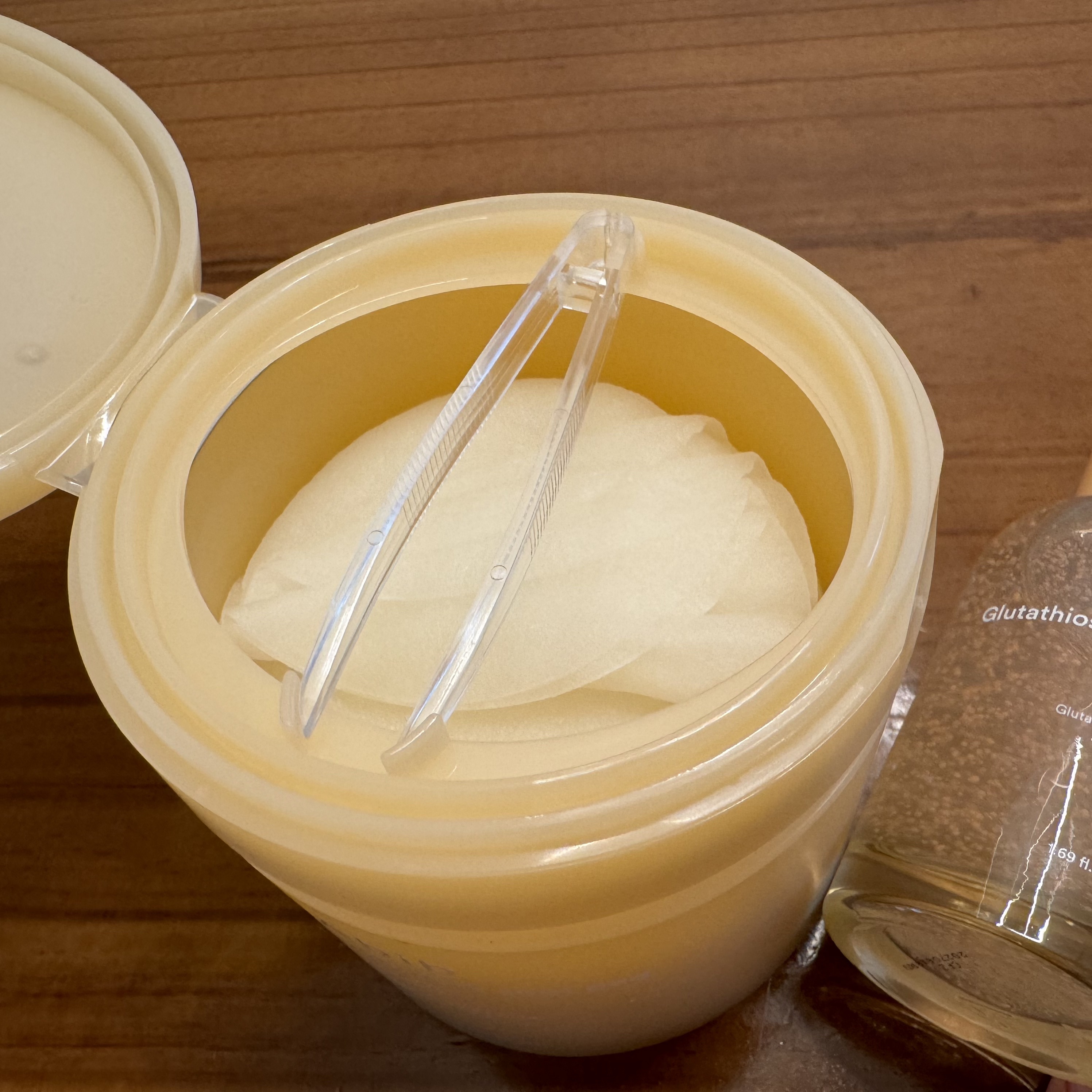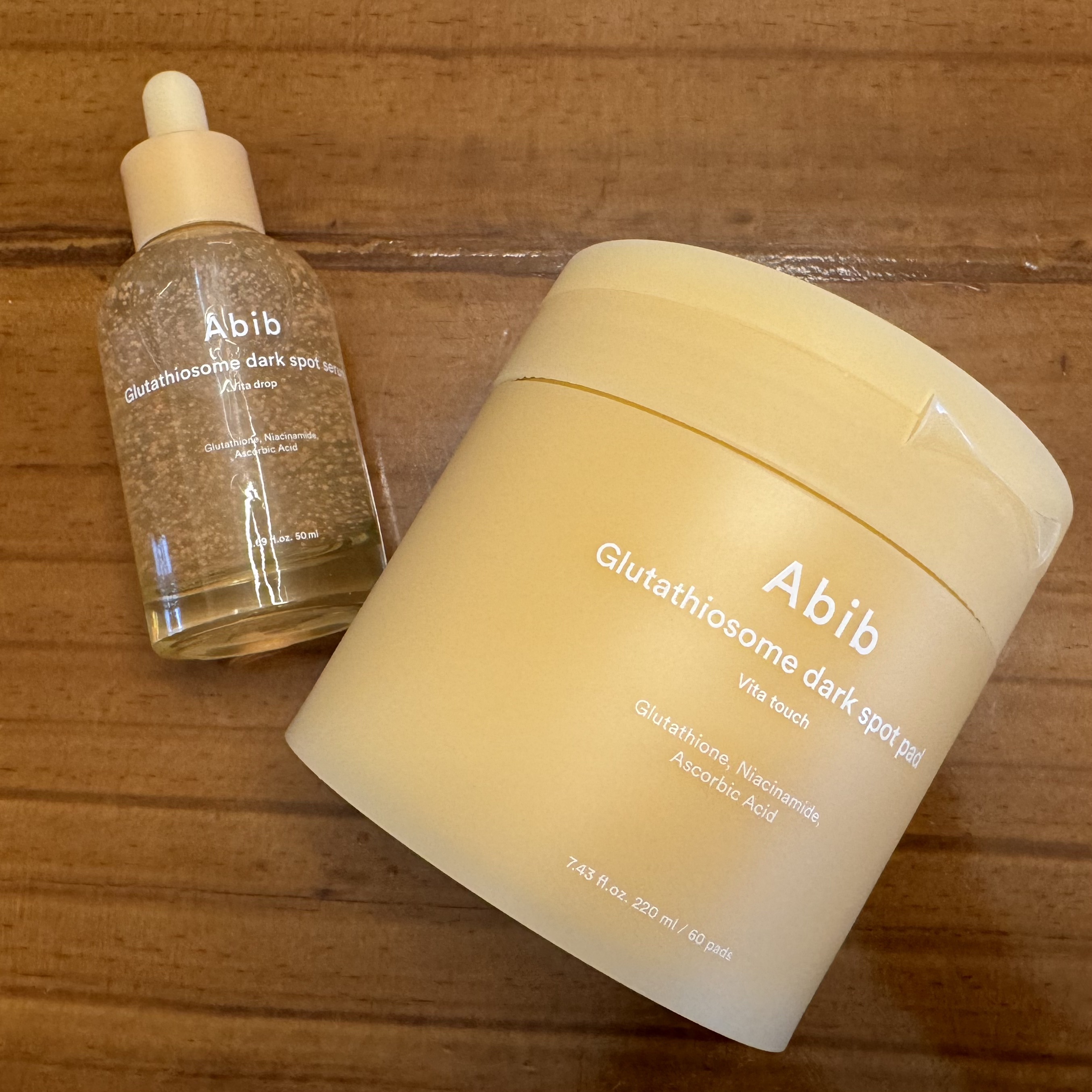 ナイアシンアミド、PlusSome® Vita C、Glutathiosomeの3つの成分でシミやくすみ改善! 塗ると肌の上で弾けるグルタチオンカプセル! ひたひたの美容液と大きめのパッドがうれしい😄 柔らかめで厚いパッドがピタッとくっつき部分ケアにとてもいいなと思いました! Abibの美白ラインは 夏の紫外線が気になる方、くすみシミを改善したい方に特におすすめです👍👍