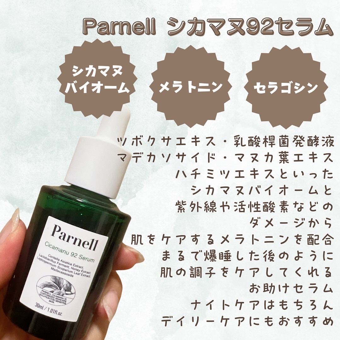 #PR@parnell.jp様よりご提供いただきました………………………………………………【parnell(パーネル)】◎シカマヌ92セラム肌荒れしやすい、肌がザラザラしがち、乾燥しやすい赤ら顔でお悩みの方におすすめの美容液です化粧水でお肌を...