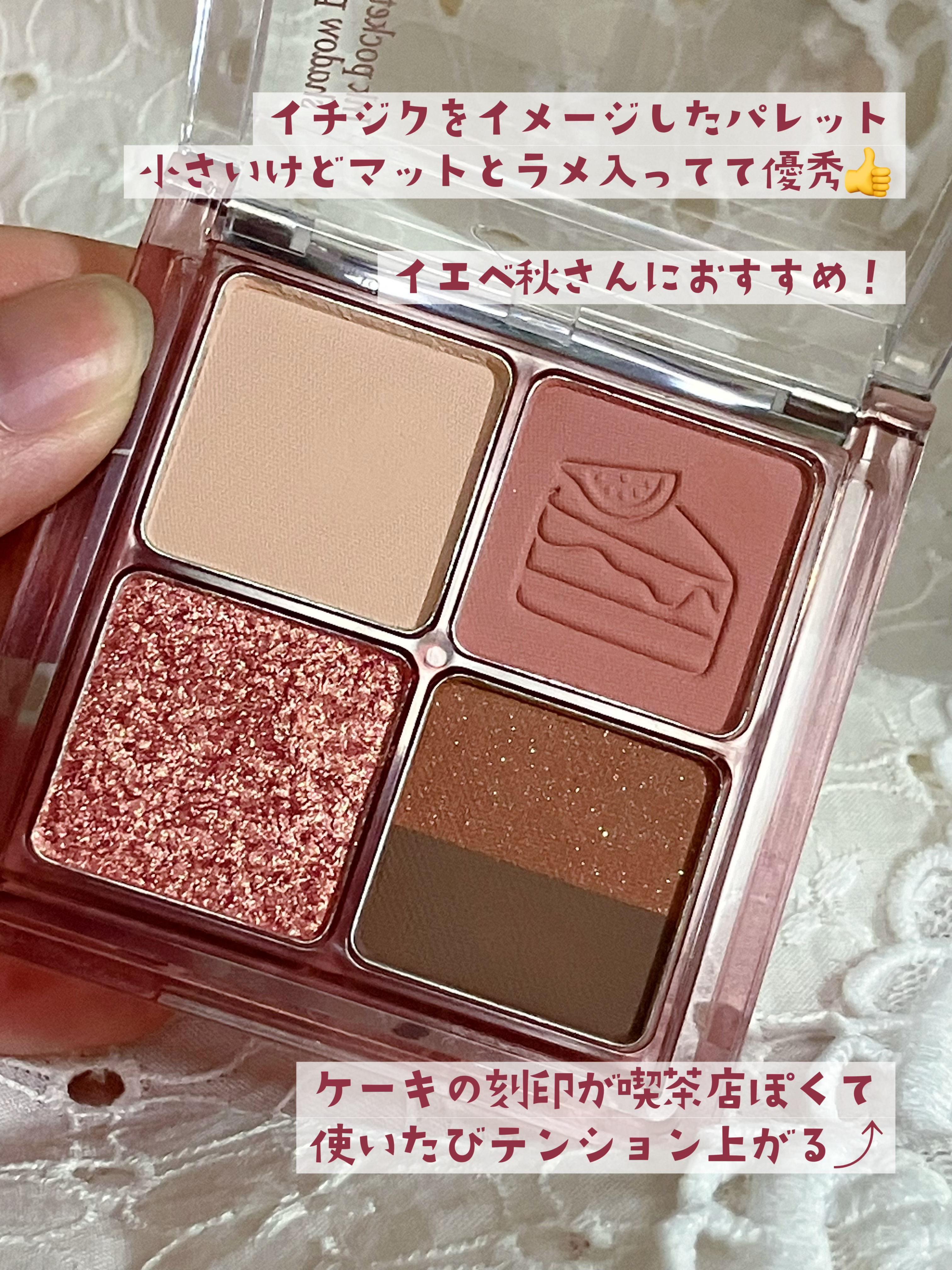peripera の喫茶店シリーズからアイシャドウがでました! イエベさん向きのいちじくカラーで、右上のコーラルカラーと左下のラメがお気に入り! この一つでマットやラメ締め色まで入ってて、普段使いから華やかなメイクまでこなせちゃう実力派パレット ケーキのパケや刻印もかわいくてビジュ大優勝すぎる🍰✨