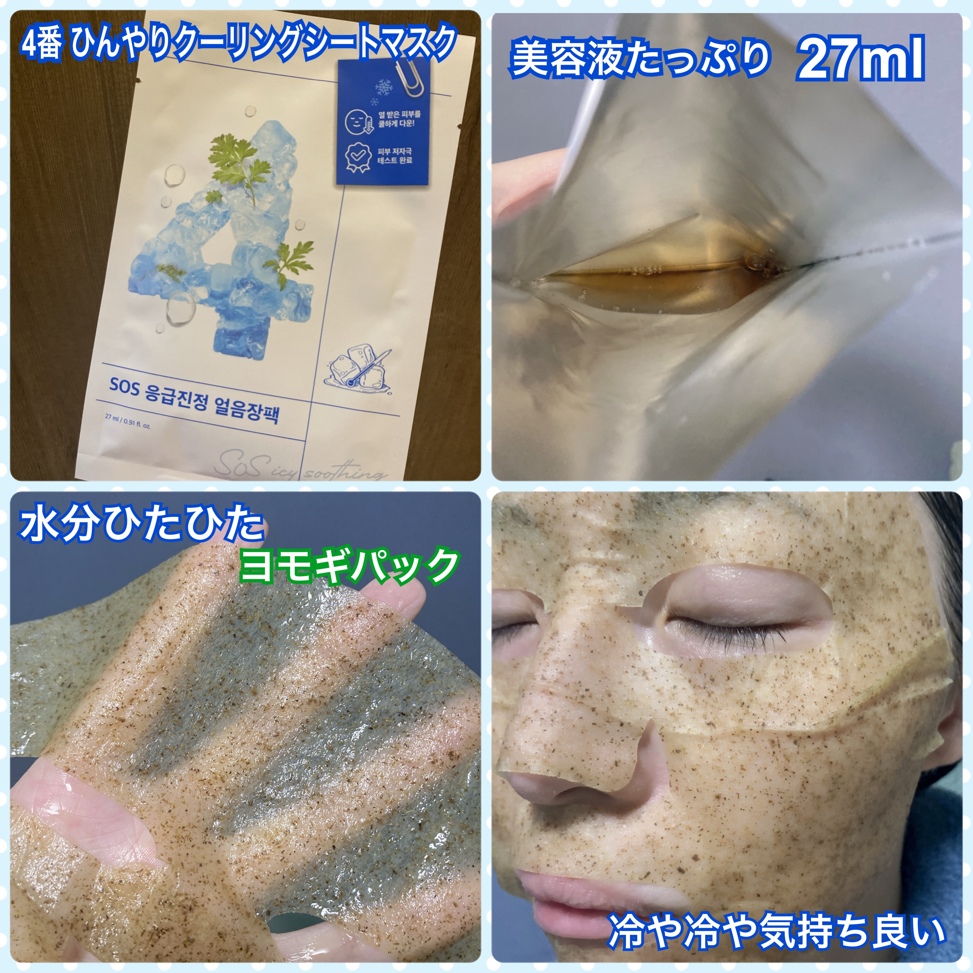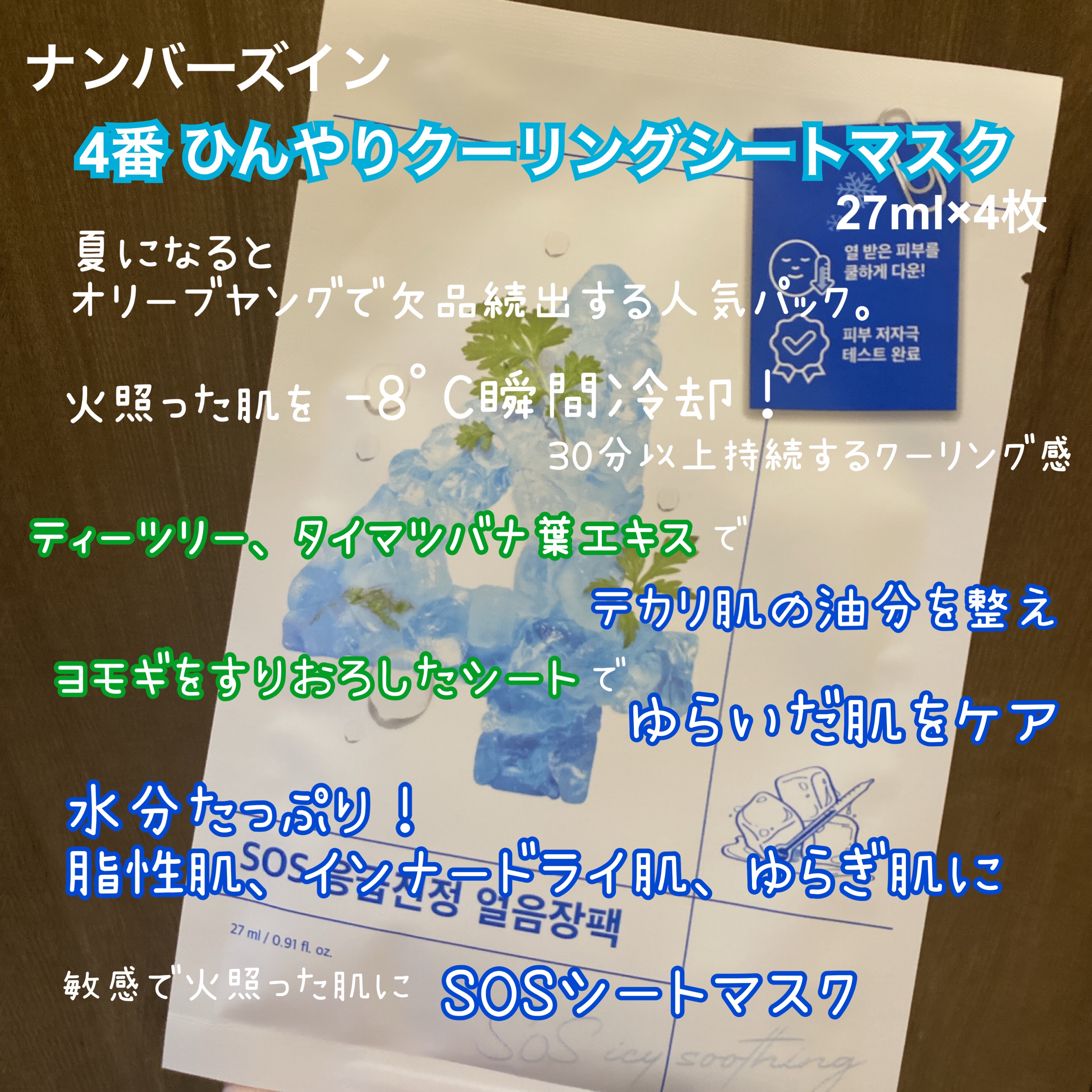 【💙ナンバーズイン4️⃣番マスク💙ひんやりクーリングマスク🧊】こんにちは、えむさんです🐑♪ナンバーズインのシートマスク✨4️⃣番はティーツリーエキスとタイマツバナ葉エキスなどを配合し肌をクーリングし水分を与えます🩵サラサラっとした美容液シート...