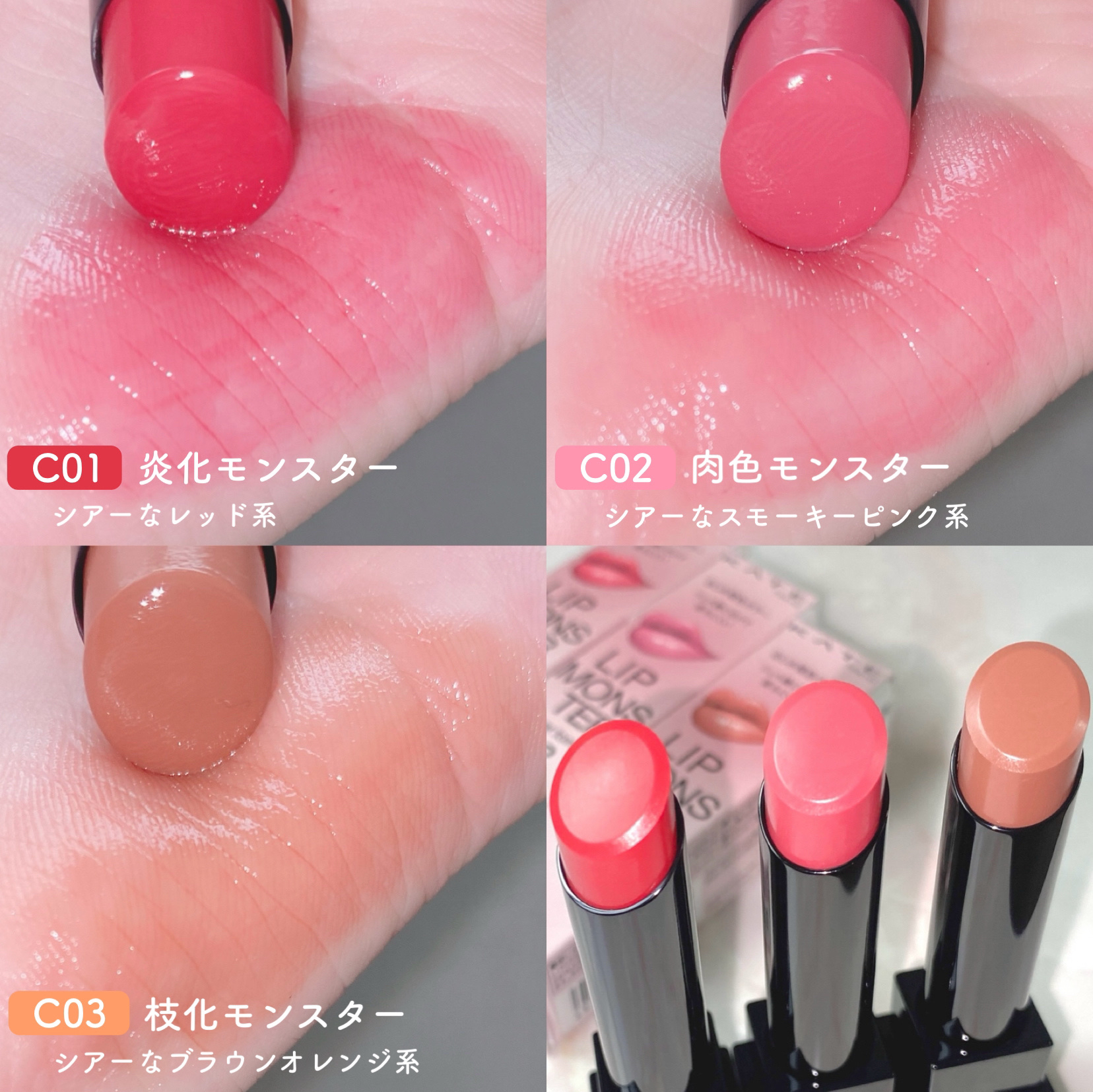 ひとぬりでとろけてツヤがあふれだす リップモンスターツヤバース。唇から蒸発する水分を活用してとろツヤジェル膜に変化する独自技術で、落ちにくい。 トロトロなのに唇に乗せると嫌なベタつきはなくてムラにもならずにスルスル伸び広がってかつしっかりカラー感も楽しめる濃密な発色♡ これは艶リップ好きさん試してみて欲しい! もし一色しか選べないとしたら私の推しはG02 ピンクムーンの雫♡