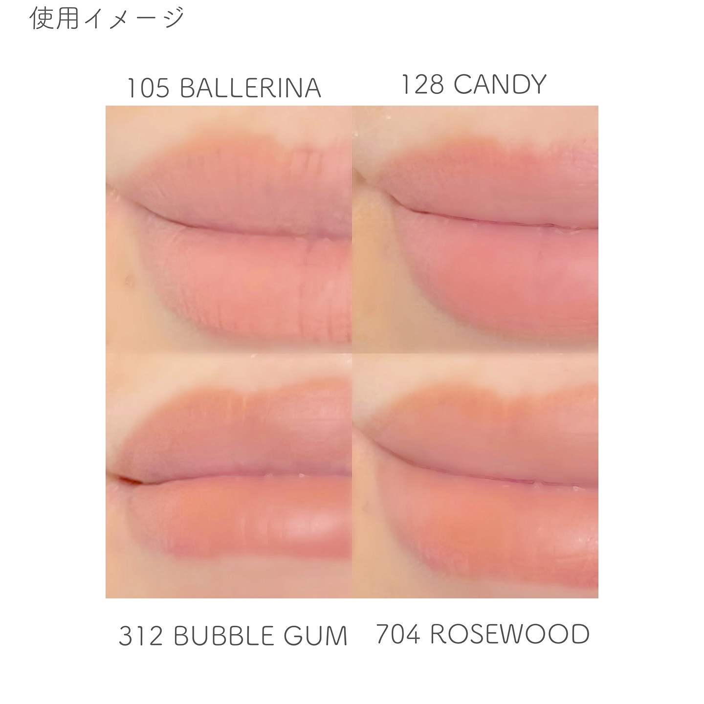 - <105 バレリーナ(Ballerina)> トリメチルシロキシケイ酸、メチルトリメチコン、ポリプロピルシルセスキオキサン、合成ミツロウ、ジメチコン、酸化チタン、マイカ、シリカ、セレシン、トリイソステアリン酸ポリグリセリル-2、(VP/ヘキサデセン)コポリマー、(アクリレーツ/アクリル酸ステアリル/メタクリル酸ジメチコン)コポリマー、酸化鉄、ジメチコンクロスポリマー、キャンデリラロウ、ポリヒドロキシステアリン酸、レシチン、トリエトキシカプリリルシラン、パルミチン酸エチルヘキシル、イソステアリン酸、ミリスチン酸イソプロピル、ポリリシノレイン酸ポリグリセリル-3、カプリル酸グリセリル、カプリリルグリコール、赤202、カニナバラ果実油、オリーブ果実油、カンジダボンビコラ/(グルコース/ナタネ油脂肪酸メチル)発酵物、ジパルミチン酸アスコルビル、トコフェロール <128 キャンディ(Candy)> トリメチルシロキシケイ酸、メチルトリメチコン、ポリプロピルシルセスキオキサン、合成ミツロウ、ジメチコン、酸化チタン、マイカ、シリカ、セレシン、トリイソステアリン酸ポリグリセリル-2、(VP/ヘキサデセン)コポリマー、(アクリレーツ/アクリル酸ステアリル/メタクリル酸ジメチコン)コポリマー、酸化鉄、ジメチコンクロスポリマー、ポリヒドロキシステアリン酸、赤202、レシチン、トリエトキシカプリリルシラン、パルミチン酸エチルヘキシル、イソステアリン酸、ミリスチン酸イソプロピル、青1、ポリリシノレイン酸ポリグリセリル-3、カプリル酸グリセリル、カプリリルグリコール、カニナバラ果実油、オリーブ果実油、カンジダボンビコラ/(グルコース/ナタネ油脂肪酸メチル)発酵物、ジパルミチン酸アスコルビル、トコフェロール <312 バブルガム(Bubble Gum)> トリメチルシロキシケイ酸、メチルトリメチコン、ポリプロピルシルセスキオキサン、合成ミツロウ、ジメチコン、酸化チタン、マイカ、シリカ、セレシン、トリイソステアリン酸ポリグリセリル-2、(VP/ヘキサデセン)コポリマー、(アクリレーツ/アクリル酸ステアリル/メタクリル酸ジメチコン)コポリマー、酸化鉄、ジメチコンクロスポリマー、キャンデリラロウ、ポリヒドロキシステアリン酸、赤202、レシチン、トリエトキシカプリリルシラン、パルミチン酸エチルヘキシル、イソステアリン酸、ミリスチン酸イソプロピル、青1、ポリリシノレイン酸ポリグリセリル-3、カプリル酸グリセリル、カプリリルグリコール、カニナバラ果実油、オリーブ果実油、カンジダボンビコラ/(グルコース/ナタネ油脂肪酸メチル)発酵物、ジパルミチン酸アスコルビル、トコフェロール <704 ローズウッド(Rosewood)> トリメチルシロキシケイ酸、メチルトリメチコン、ポリプロピルシルセスキオキサン、合成ミツロウ、ジメチコン、酸化チタン、マイカ、シリカ、セレシン、トリイソステアリン酸ポリグリセリル-2、酸化鉄、(VP/ヘキサデセン)コポリマー、(アクリレーツ/アクリル酸ステアリル/メタクリル酸ジメチコン)コポリマー、ジメチコンクロスポリマー、キャンデリラロウ、ポリヒドロキシステアリン酸、レシチン、トリエトキシカプリリルシラン、パルミチン酸エチルヘキシル、イソステアリン酸、ミリスチン酸イソプロピル、リンゴ酸ジイソステアリル、ポリリシノレイン酸ポリグリセリル-3、赤202、カプリル酸グリセリル、カプリリルグリコール、ジイソステアリン酸ポリグリセリル-2、カニナバラ果実油、オリーブ果実油、カンジダボンビコラ/(グルコース/ナタネ油脂肪酸メチル)発酵物、ジパルミチン酸アスコルビル、トコフェロール