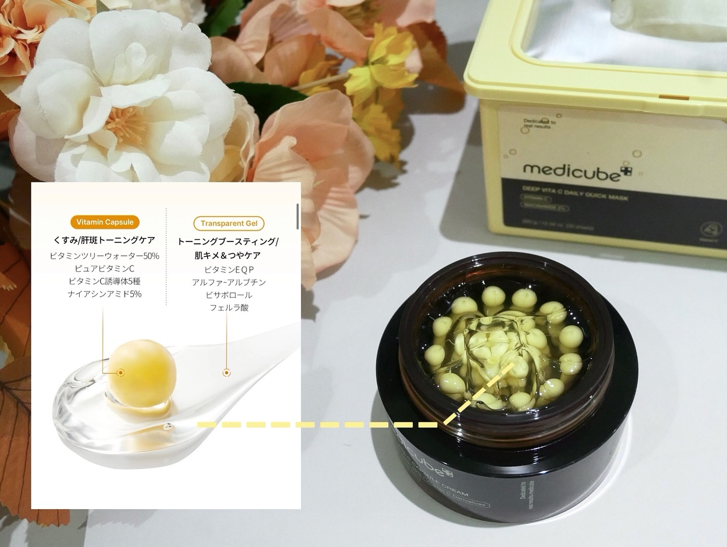 注ぎ込んだ、60秒* ブライトニングシート リポソーム化したビタミンCカプセル入り! ピュアビタミンC・ナイアシンアミド・ビタミンツリーウォーター・ビタミンC誘導体5種がぎゅっと詰まっています。 朝は透明ジェルだけ、夜はカプセルとジェルを1:1ぐらいの割合で塗ってるよ✌️