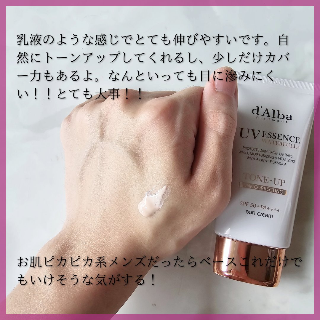 ダルバ ウォータフル トーンアップ サンクリーム パープルはかなりしっかりめにトーンアップしてくれます◎ カラーはブルベ向きの色です! ダルバ ウォータフル トーンアップ サンクリーム ピンクはイエベ、ブルベどちらもOKなので何を買うか悩んでいる方にはこれがおすすめ! ダルバ ウォータフル エッセンス サンクリームは下地としてではなく日焼け止めとして使用します。無色なので首などの全身塗れます!