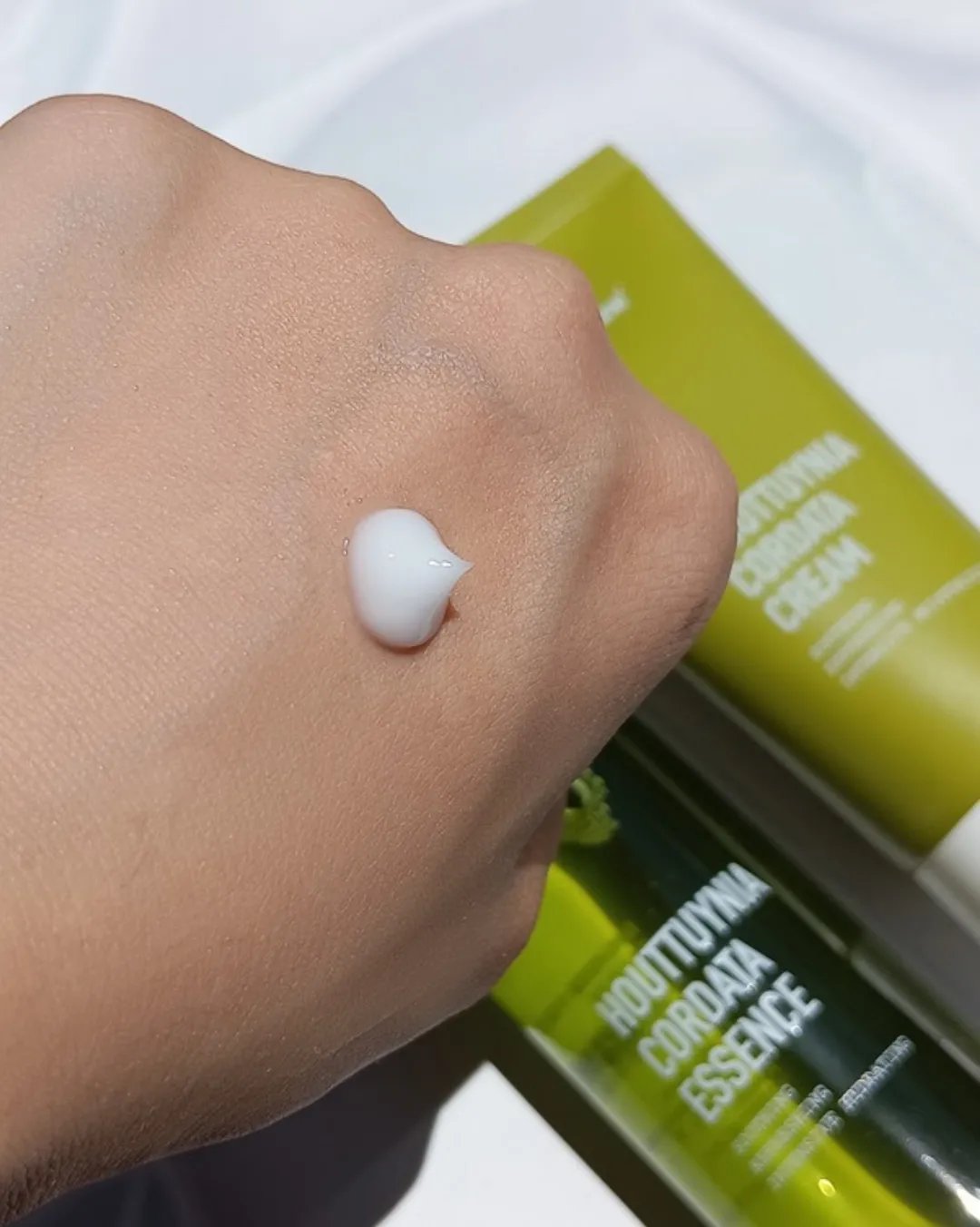 ドクダミエキス90%以上配合で優れた鎮静効果🌿デイメロウ ドクダミ基礎スキンケアセット💚 エッセンスのテクスチャーはティーツリーオイルの良い香りで潤いを感じるサッパリとした使用感です✨ クリームのテクスチャーはジェル状でなめらかに伸び乾燥を防いでくれるような使用感です💛お肌への肌馴染みが早くて◎ 韓国の薬店販売1位⚜️だそうで、ドクダミ90%配合👀❗毛穴やストレスによる大人ニキビなどの肌荒れに効果が期待できます😌 このようなエッセンス&クリームをお探しの方に使いやすいと思います😊