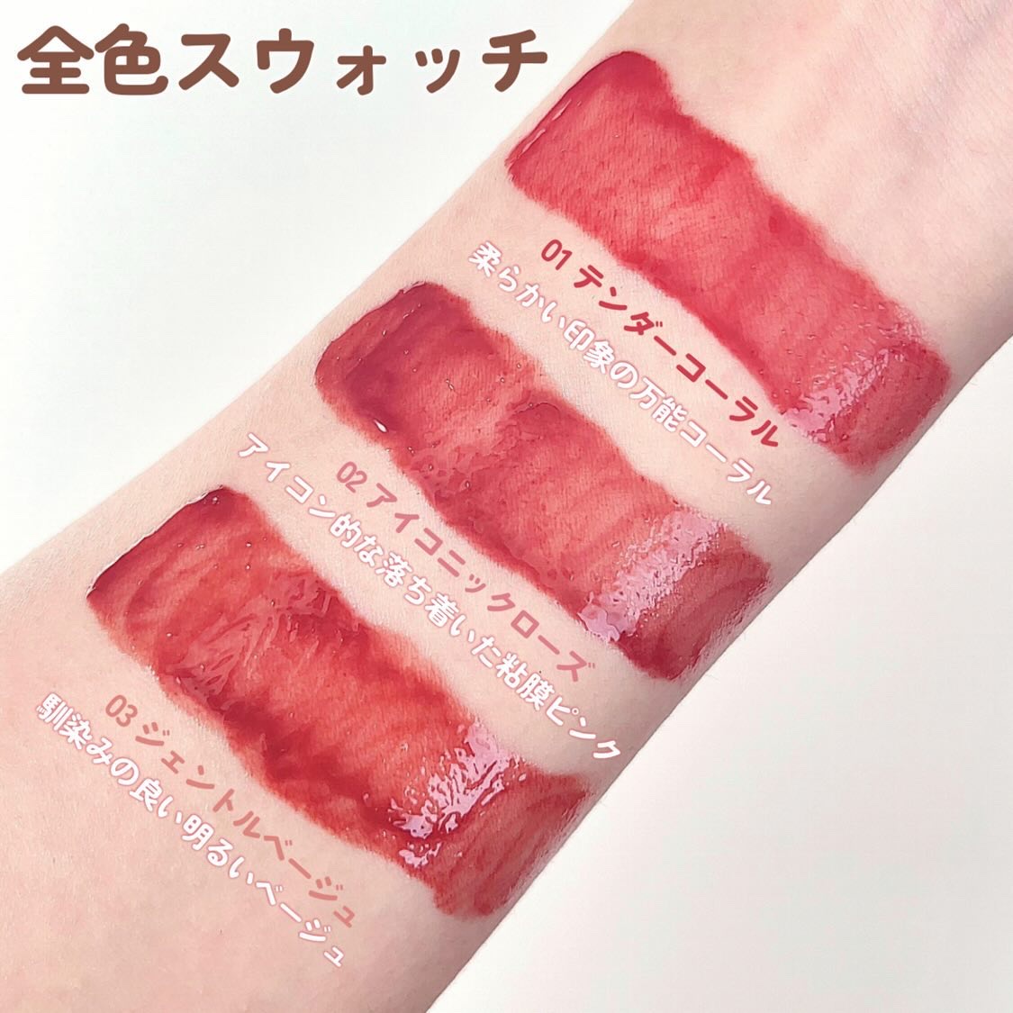 - <01 テンダーコーラル> 水、ダイマージリノール酸ダイマージリノレイルビス(ベヘニル/イソステアリル/フィトステリル)、ビスジグリセリルポリアシルアジペート-2、ジグリセリン、リンゴ酸ジイソステアリル、ジフェニルジメチコン、セチルPEG/PPG-10/1ジメチコン、ペンチレングリコール、トリメチルシロキシケイ酸、カプリリルメチコン、ポリソルベート60、セテアレス-20、ジメチコン、イソドデカン、グリセリン、(アクリル酸ヒドロキシエチル/アクリロイルジメチルタウリンNa)コポリマー、スクワラン、1,2-ヘキサンジオール、ポリアクリレート-13、ポリイソブテン、エチルヘキシルグリセリン、イソステアリン酸ソルビタン、トリイソステアリン酸ポリグリセリル-2、エチレンジアミンジコハク酸3Na、ポリソルベート20、水酸化Al、ポリアクリル酸アンモニウム、BG、アラントイン、ナイアシンアミド、トリ(カプリル酸/カプリン酸)グリセリル、水添レシチン、マカデミア種子油、アブラナステロールズ、ツボクサエキス、レチノール、コレステロール、ラウリン酸ポリグリセリル-10、セラミドNP、ラウロイルグルタミン酸ジ(オクチルドデシル/フィトステリル/ベヘニル)、ステアリン酸水酸化(Al/Mg)、セチルリン酸K、キトサン、クエン酸トリス(テトラメチルヒドロキシピペリジノール)、テトラ(ジ-t-ブチルヒドロキシヒドロケイヒ酸)ペンタエリスリチル、香料、フェノキシエタノール、酸化チタン、黄4、黄5、青1、赤227、赤104(1) <02 アイコニックローズ> 水、ダイマージリノール酸ダイマージリノレイルビス(ベヘニル/イソステアリル/フィトステリル)、ビスジグリセリルポリアシルアジペート-2、ジグリセリン、リンゴ酸ジイソステアリル、ジフェニルジメチコン、セチルPEG/PPG-10/1ジメチコン、ペンチレングリコール、トリメチルシロキシケイ酸、カプリリルメチコン、ポリソルベート60、セテアレス-20、ジメチコン、イソドデカン、グリセリン、(アクリル酸ヒドロキシエチル/アクリロイルジメチルタウリンNa)コポリマー、スクワラン、1,2-ヘキサンジオール、ポリアクリレート-13、ポリイソブテン、エチルヘキシルグリセリン、イソステアリン酸ソルビタン、エチレンジアミンジコハク酸3Na、ポリソルベート20、水酸化Al、ポリアクリル酸アンモニウム、BG、アラントイン、ナイアシンアミド、トリ(カプリル酸/カプリン酸)グリセリル、水添レシチン、マカデミア種子油、アブラナステロールズ、ツボクサエキス、レチノール、コレステロール、ラウリン酸ポリグリセリル-10、セラミドNP、ラウロイルグルタミン酸ジ(オクチルドデシル/フィトステリル/ベヘニル)、ステアリン酸水酸化(Al/Mg)、セチルリン酸K、キトサン、クエン酸トリス(テトラメチルヒドロキシピペリジノール)、テトラ(ジ-t-ブチルヒドロキシヒドロケイヒ酸)ペンタエリスリチル、香料、フェノキシエタノール、酸化チタン、黄4、黄5、青1、赤104(1)、赤227 <03 ジェントルベージュ> 水、ダイマージリノール酸ダイマージリノレイルビス(ベヘニル/イソステアリル/フィトステリル)、リンゴ酸ジイソステアリル、ビスジグリセリルポリアシルアジペート-2、ジグリセリン、ジフェニルジメチコン、セチルPEG/PPG-10/1ジメチコン、ペンチレングリコール、トリメチルシロキシケイ酸、カプリリルメチコン、ポリソルベート60、セテアレス-20、ジメチコン、イソドデカン、グリセリン、(アクリル酸ヒドロキシエチル/アクリロイルジメチルタウリンNa)コポリマー、スクワラン、1,2-ヘキサンジオール、ポリアクリレート-13、ポリイソブテン、エチルヘキシルグリセリン、イソステアリン酸ソルビタン、トリイソステアリン酸ポリグリセリル-2、エチレンジアミンジコハク酸3Na、ポリソルベート20、水酸化Al、ポリアクリル酸アンモニウム、BG、アラントイン、ナイアシンアミド、トリ(カプリル酸/カプリン酸)グリセリル、水添レシチン、マカデミア種子油、アブラナステロールズ、ツボクサエキス、レチノール、コレステロール、ラウリン酸ポリグリセリル-10、セラミドNP、ラウロイルグルタミン酸ジ(オクチルドデシル/フィトステリル/ベヘニル)、ステアリン酸水酸化(Al/Mg)、セチルリン酸K、キトサン、クエン酸トリス(テトラメチルヒドロキシピペリジノール)、テトラ(ジ-t-ブチルヒドロキシヒドロケイヒ酸)ペンタエリスリチル、香料、フェノキシエタノール、酸化チタン、酸化鉄、黄4、黄5、青1、赤104(1)、赤227 <04 ブリスフルピンク> 水、ダイマージリノール酸ダイマージリノレイルビス(ベヘニル/イソステアリル/フィトステリル)、ビスジグリセリルポリアシルアジペート-2、ジグリセリン、リンゴ酸ジイソステアリル、ジフェニルジメチコン、セチルPEG/PPG-10/1ジメチコン、ペンチレングリコール、トリメチルシロキシケイ酸、カプリリルメチコン、ポリソルベート60、セテアレス-20、ジメチコン、イソドデカン、グリセリン、(アクリル酸ヒドロキシエチル/アクリロイルジメチルタウリンNa)コポリ