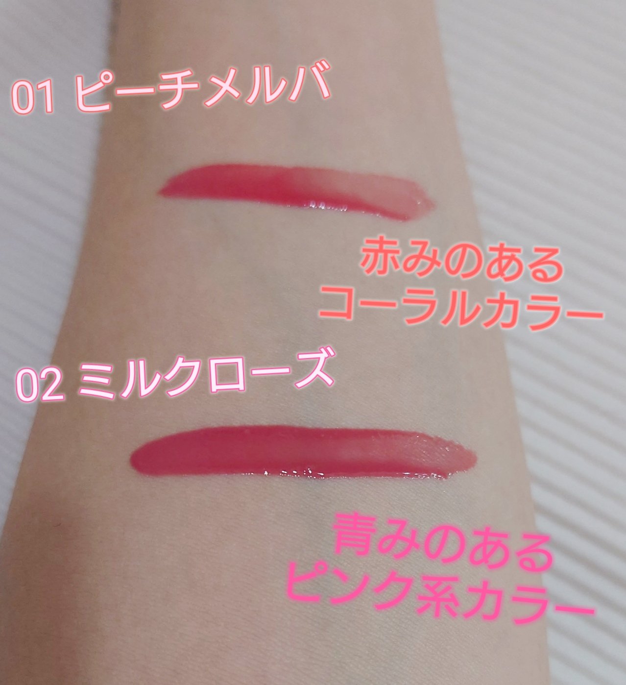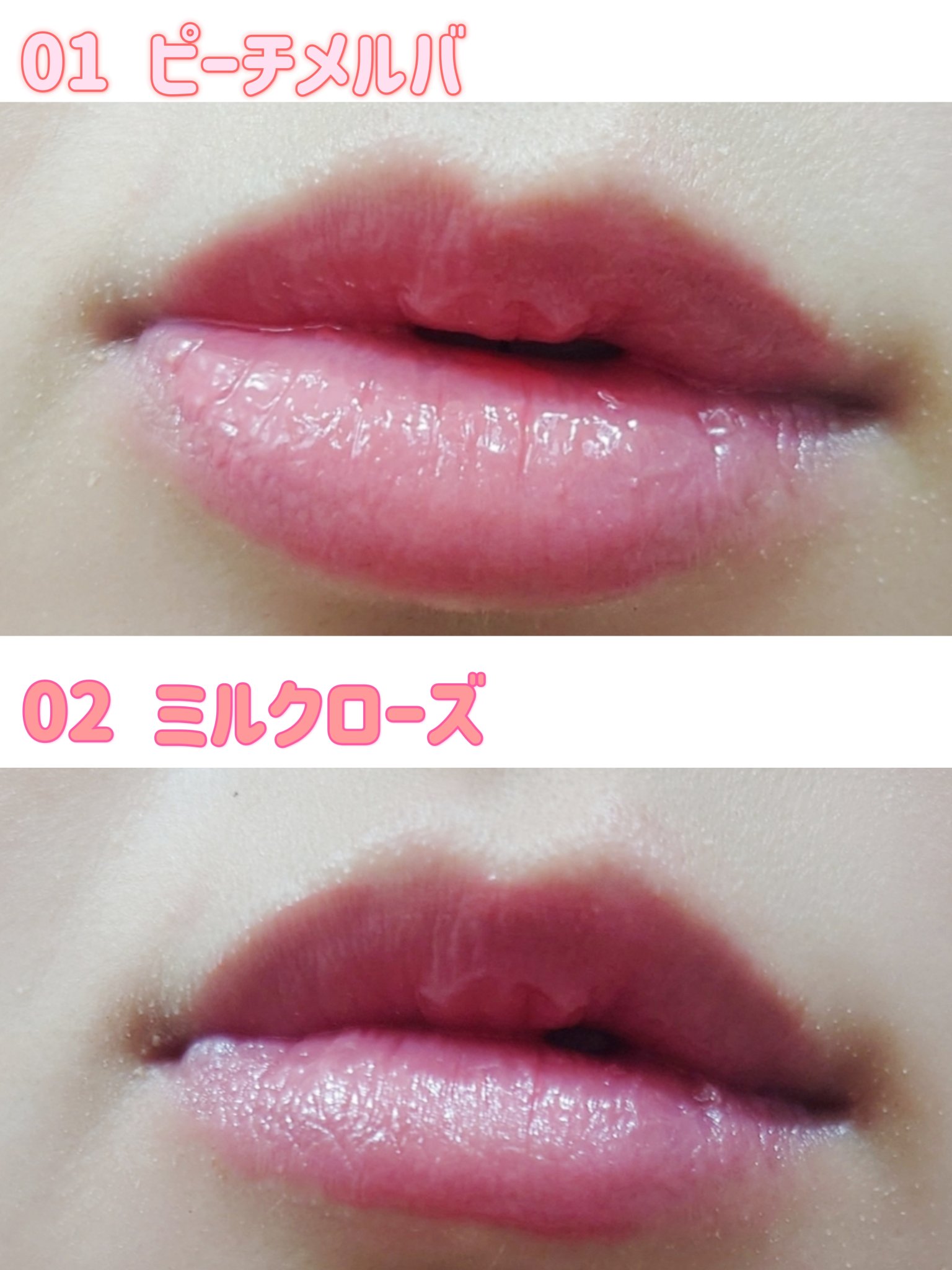 - <01 ピーチメルバ> ミネラルオイル、水添ポリイソブテン、マイクロクリスタリンワックス、リンゴ酸ジイソステアリル、ヒドロキシステアリン酸エチルヘキシル、パルミチン酸デキストリン、ジメチルシリル化シリカ、フェノキシエタノール、メチルパラベン、トコフェロール、シメチコン、水、BG、ユズ果実エキス、モウソウチクたけのこ皮エキス、チャ葉エキス、セイヨウハッカ葉エキス、酸化チタン、黄5、赤202、黄4、酸化鉄、ラウロイルリシン、赤104(1)、水酸化Al、シリカ <02 ミルクローズ> ミネラルオイル、水添ポリイソブテン、マイクロクリスタリンワックス、リンゴ酸ジイソステアリル、ヒドロキシステアリン酸エチルヘキシル、パルミチン酸デキストリン、ジメチルシリル化シリカ、フェノキシエタノール、メチルパラベン、トコフェロール、シメチコン、水、BG、ユズ果実エキス、モウソウチクたけのこ皮エキス、チャ葉エキス、セイヨウハッカ葉エキス、酸化チタン、黄5、赤202、青1、ラウロイルリシン、水酸化Al、酸化鉄、シリカ