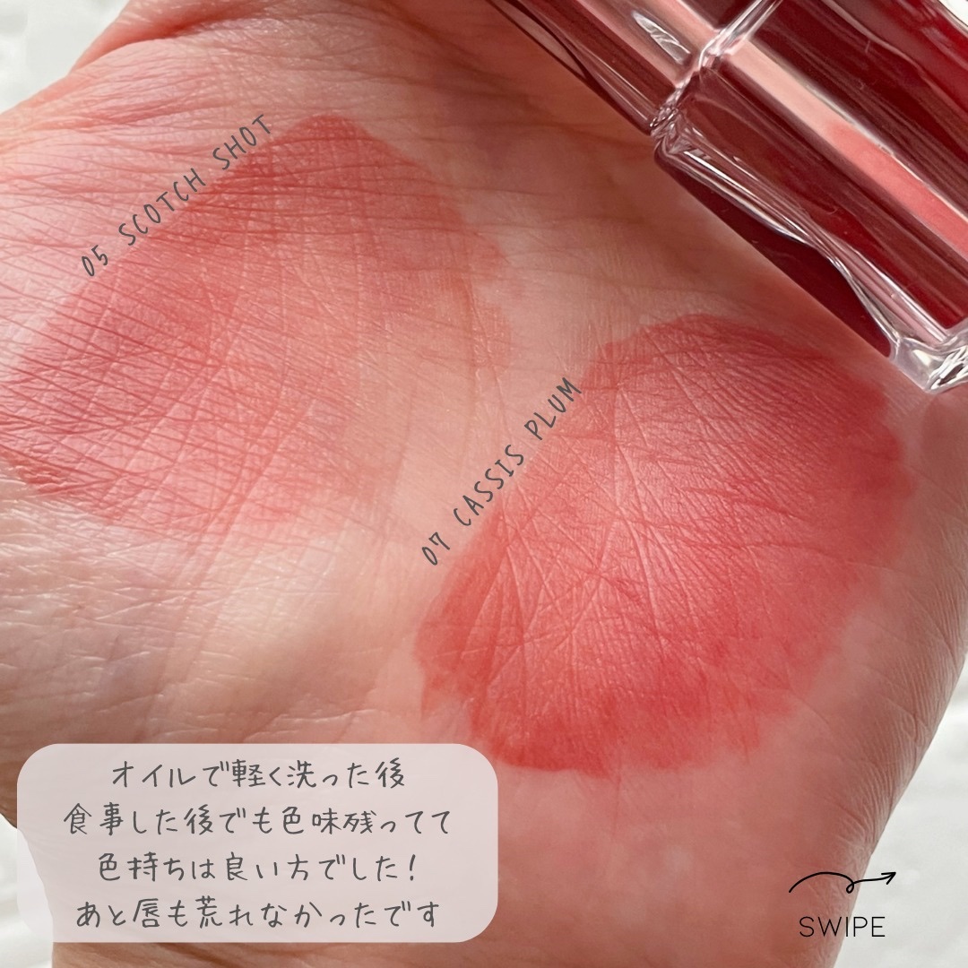 ティントは、透明感のある発色で、カラーとみずみずしい質感が持続してくれるティント!塗るときにムラになりにくいのも良かった💡 バームは、ナチュラルな発色で、ツヤっとした光沢感がきれい✨ 保湿感がほしいときに使うのがおすすめ!