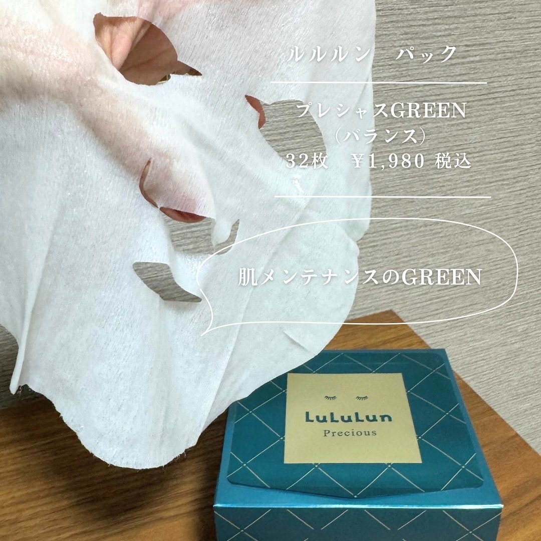 ルルルンは、毎日の化粧水の代わりに使えるフェイスマスクです。 年齢による肌悩みに合わせて選べるような商品展開がされており、今回はプレシャスシリーズ【バランス】をご紹介します。 プレシャスシリーズは20~30代の変化を感じる大人の肌にピッタリ✨ 中でも🟢プレシャスグリーンは、崩れやすい大人の肌*にオススメです。 パック自体は5分〜10分程度肌に貼ってますが、乾燥することもなくしっかり水分ケアをすることができます! 普段コットンパックがめんどくさいと感じてる方にもぜひ試してほしい商品です☺️