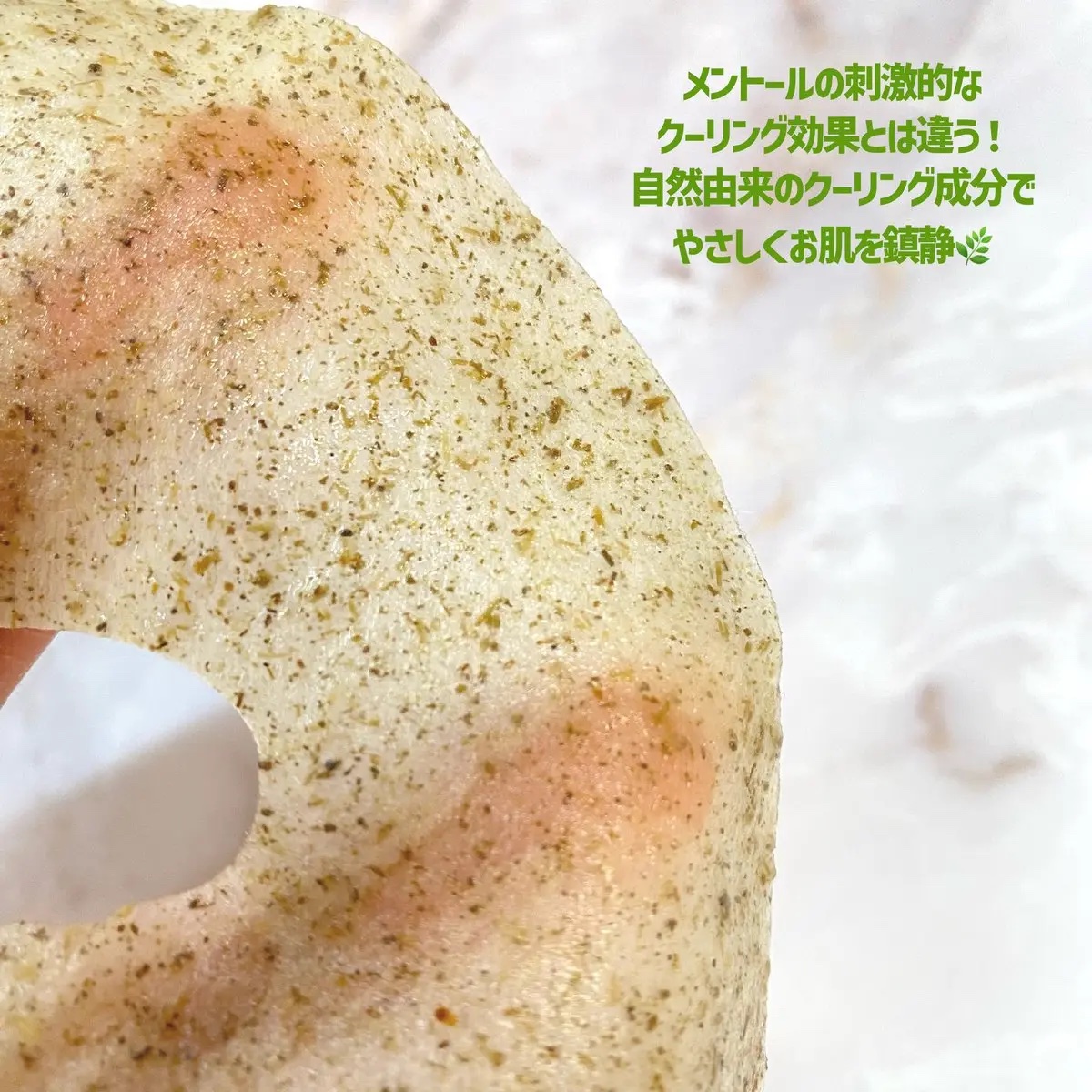 シャバシャバの液で清涼感のあるマスク。 肌を冷やしてくれるのでメイク前にもおすすめ。 開けた瞬間特徴的なシートにびっくり🙂 練り込まれた粒はなんとヨモギのすりおろし。 普通のシートよりしっかりした素材なので顔のパーツの凹凸からは浮き気味に感じる。