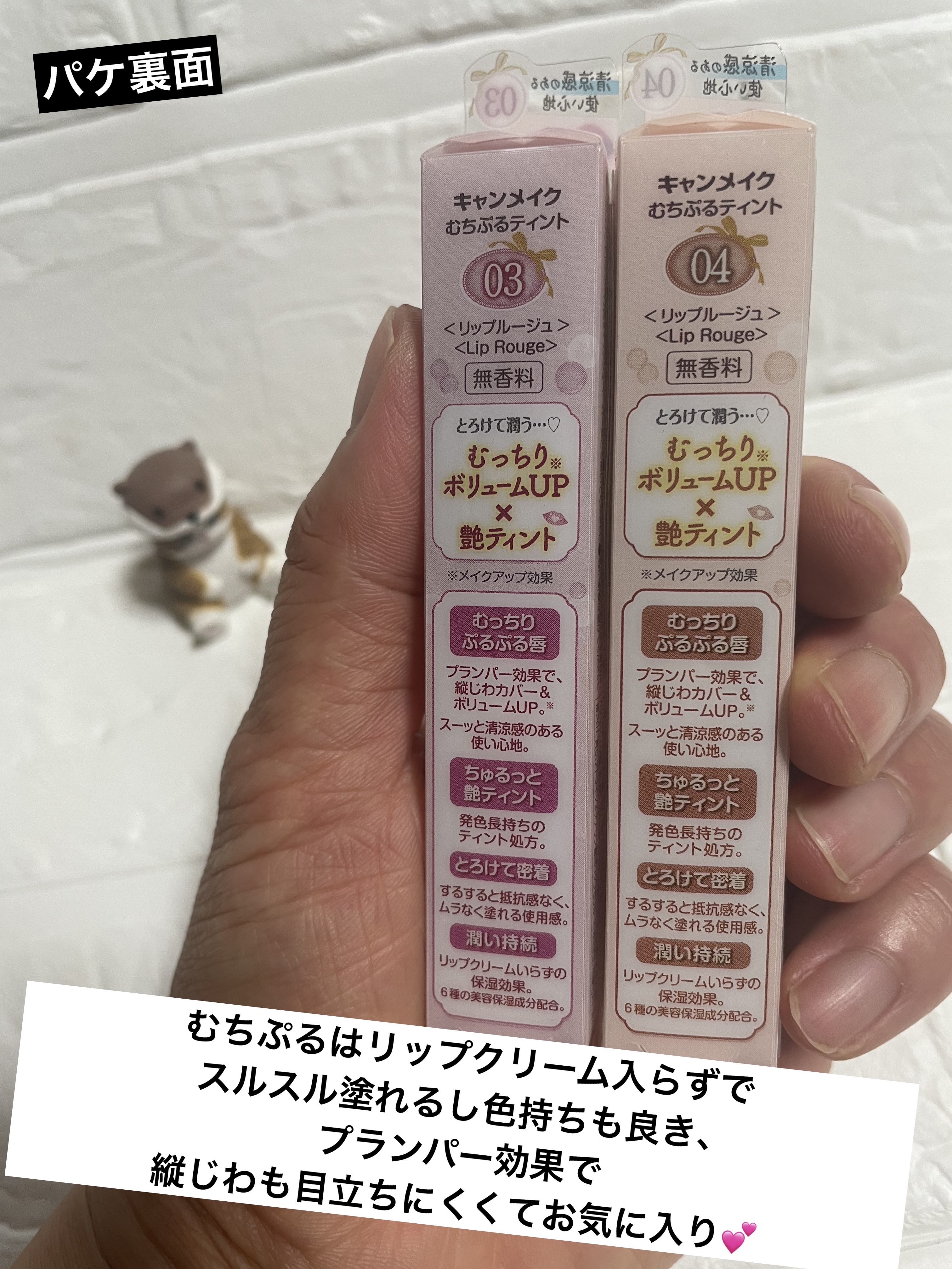 - とろけて潤うむっちりぷるぷる唇に! その名の通り、むっちりとしたボリューム感とぷるぷるツヤツヤな魅力的な唇に仕上がるティントリップです。 Point1【むっちりぷるぷる唇】 ・プランパー効果で縦じわカバー&ボリューム感のあるむっちり唇に ※メイクアップ効果による ・スーッとした清涼感のある使い心地 Point2【ちゅるんとしたツヤティント】 ・シロップのようなちゅるんとしたツヤが持続 ・塗った時の色が長持ちするティント処方 唇の上でとろけるメルティングオイルを配合しています。 するすると抵抗感がなく、なめらかな塗り心地で、重ね塗りをしてもムラなくきれいに仕上がります。 6種の美容保湿成分配合。リップクリームいらずで潤いが持続します。 ≪ワセリン・ヒアルロン酸・コラーゲン・アルガンオイル・ハチミツ・シアバター≫ 無香料 ・清涼感のある使い心地です。 ・大変やわらかい中身ですので、1㎜程度くり出して、ゆっくりやさしく塗布してください。 ・一度繰り出した中身は戻りませんので、出し過ぎにご注意ください。
