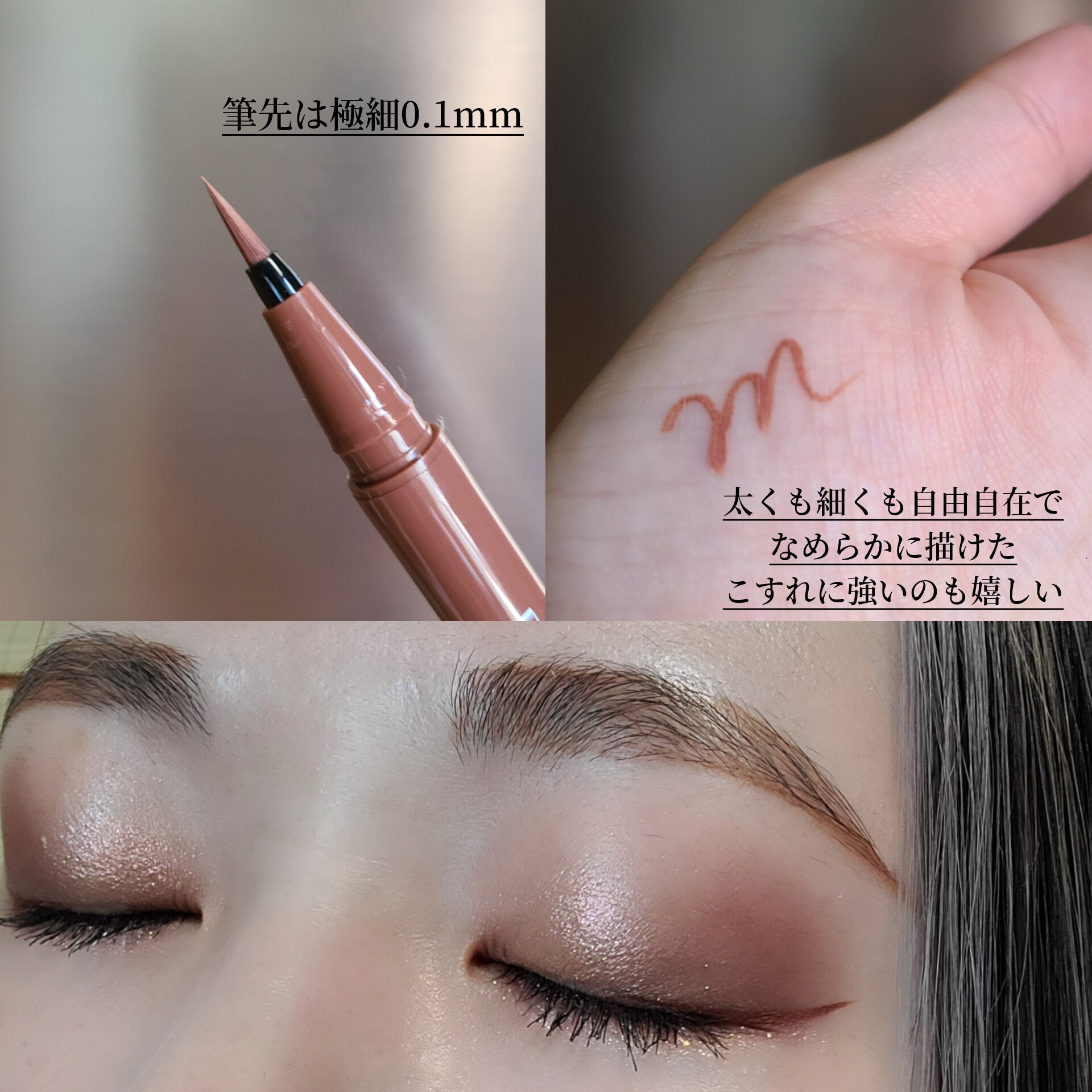 - 筆先までずっとなめらか、目尻で感動するリキッドアイライナー。 必要な量が肌にのる新設計で、まぶたの上をすべるような、滑らかな描き心地。しなやかでコシのある筆が、筆圧のコントロールを容易にし、太いラインも細いラインも思い通りに仕上げます。水、汗、涙に強いウォータープルーフタイプなのに、通常洗顔で簡単オフ。肌に色素が残らない顔料を使用。5種類の美容液成分を従来品の200%配合し、メイクしながら目元ケアまで。 ●ブラウンブラック ※2020年9月12日 バラエティショップ先行発売 ●漆黒ブラック ※2020年12月頃発売予定 ●ナチュラルブラウン ※2020年12月頃発売予定 ●シフォンブラウン 「毎日メイクに透明感と抜け感」 ブラウンでも、グレーでも、ベージュでもないニュアンスカラー。 自然な印影で素の目元を際立て、頑張りすぎない、ふんわりとした目元に。 ●アプリコットブラウン 「じゅわっと血色感。 肌に馴染むおしゃれカラー」 温かみのあるアプリコットがじゅわっと滲む血色感を目元に演出。 肌馴染みが良いので、カラーライナーに抵抗がある方もブラウンの延長線上で楽しめる、使いやすい色味です。 ”ちょっとオシャレ”な空気感を演出するカラー。 ●ピンクショコラ アイライナー 「ピンクが溶け込む濃厚ブラウン」 肌馴染みが良く、目元にじんわり血色感をプラス。 さりげなく女性らしさが加速するようなカラー。 ●ピスタチオラテ (2022年7月29日(金)発売) 「“目尻”に抜け感アクセント」 肌に馴染むのに映える絶妙なグリーン。 トレンドカラーに“くすみ”と“抜け感”をプラスしたまろやかな発色。 ●マスタードブラウン 「“イエロー”が揺れる、大人の洒落色」 (2022年7月29日(金)発売) まるで太陽のような暖かさを感じる新しいブラウン。 ほんのり感じるイエローでメイクが一気に垢抜ける稀有な色。 ●シフォンピンク(2023年2月10日発売) 「ふんわり柔らか"まろみピンク"」 甘くなりすぎない青みニュアンスで目元の透明感UP。 目元を引き締め、ピンクメイクにありがちな腫れぼったさを解消。 ●ミルクカプチーノ(2023年4月21日発売) まろやかな深みの“優しい締め色” どんなメイクにも合わせやすいカラー。 自然な陰影でさりげなく目幅を拡張します。 ●グレーカシミア(2023年10月1日発売) ブラウンがほんのり溶け込んだ、暖色グレー まろやかな発色で、パーソナルカラーを問わず肌に馴染む 目元の陰影になりすまし、抜け感と目力を欲張りに叶える ●ダークフィグ(2024年6月1日発売) するする”なめらか。描きやすいのに、落ちにくい。 クッキリ可愛いほの甘ダークブラウン ●ピーチモカ(2024年8月1日発売) ふわっと自然に盛れる“桃色ブラウン” ほんのり血色感で目元にうるみ感を演出 ●スターダストブラウン(2024年12月11日発売) キラッと繊細に輝く''星屑ブラウン'' 透け感のあるダークブラウンの色味とラメの輝きが、目元に艶のある立体感を演出 ●チャコールモカ(2025年4月10日発売) 目元を締める''深みグレージュ'' 黄みや赤みに偏りすぎない絶妙な色設計で、自然に目元を強調