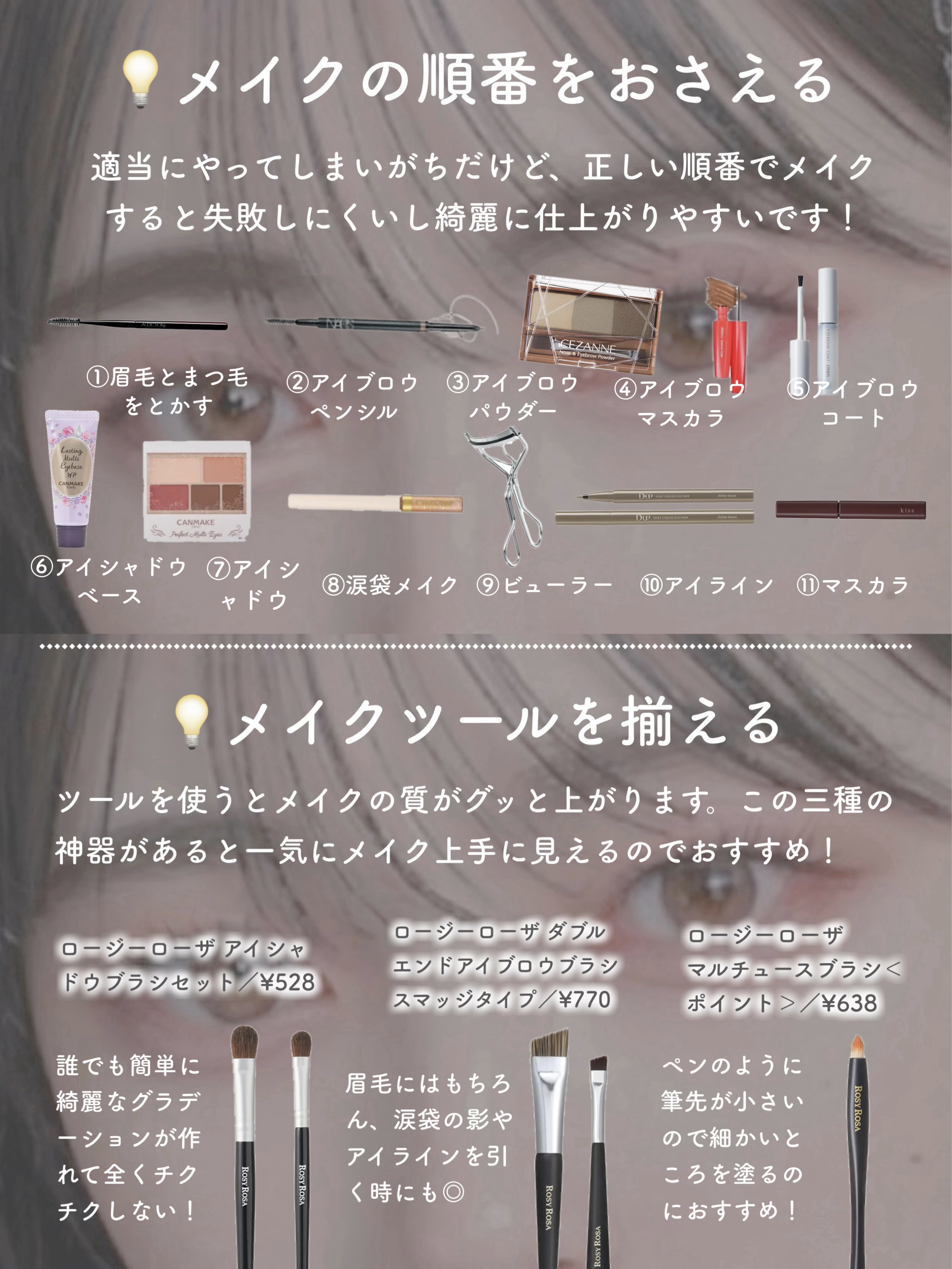 ベースメイクの順番はファンデーションの種類によっても違うのですが、 アイメイクはアイシャドウ→ビューラー→アイライン→マスカラという順番で行います。 アイメイクとのバランスを考えながら、どのリップを塗るかを決めます。 パウダーチークとクリームチークがありますが、クリームチークはムラになりやすいので初心者さんはパウダーがいいかも🙆♀️ ベースメイクの最後でもOKですが、全体のバランスを見ながら入れることでシェーディングが濃くなりすぎたりハイライトを付けすぎるなどの失敗が少なくなります。