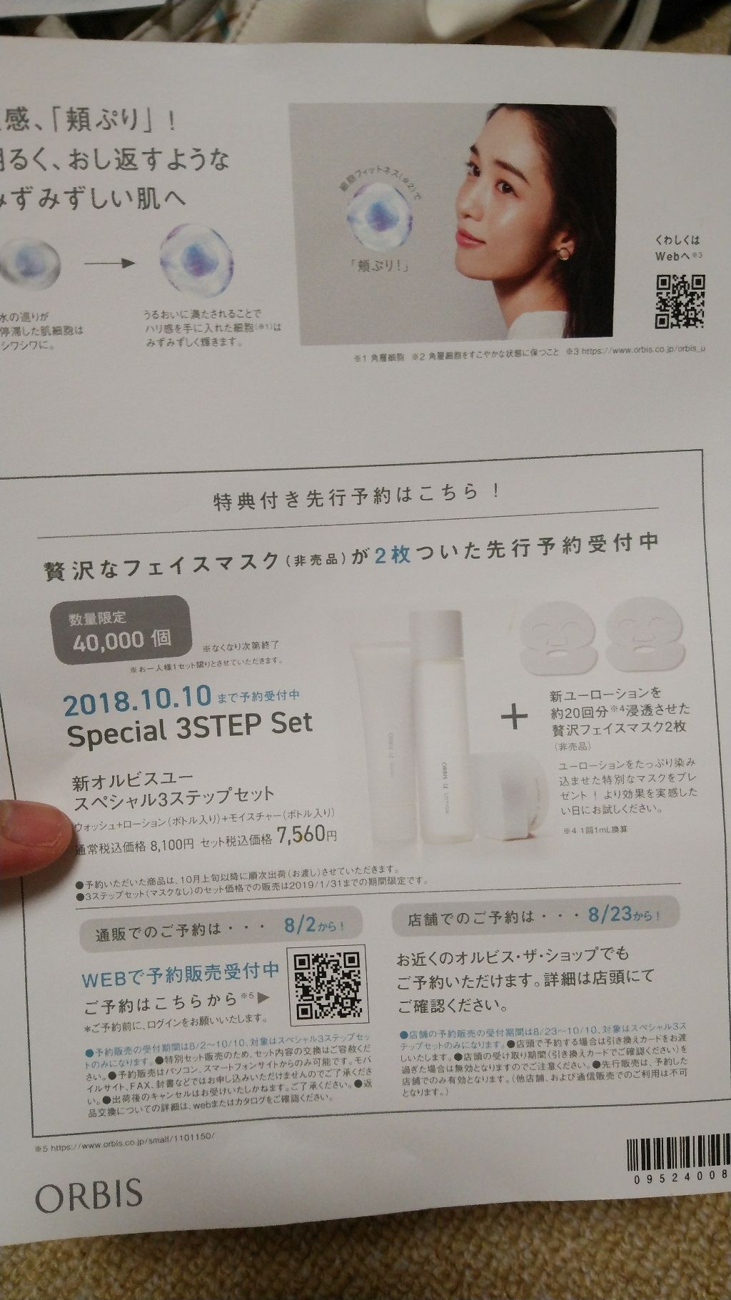 【新・オルビスユー フェイスマスク付きセット】9月某日に予約したものが、昨日から受け取れるということだったので早速行ってきました♩1枚目:セットの中身2枚目:貰ったリーフレットの一部3・4枚目:非売品のフェイスマスク洗顔料、化粧水、保湿ジェル...