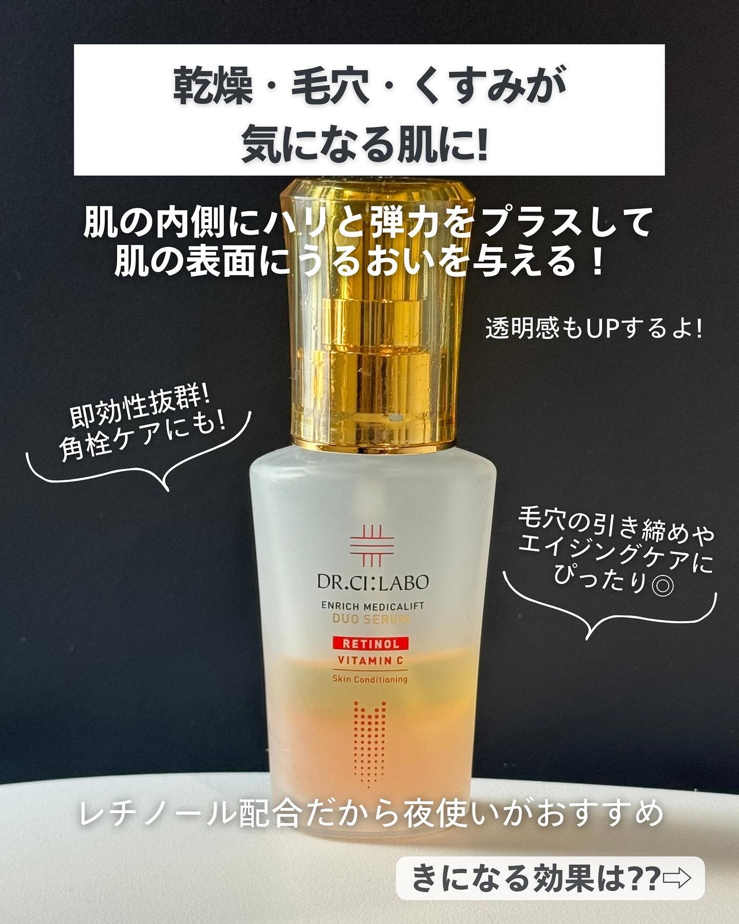 同時配合が難しい2大成分をドクターシーラボ独自処方 “2層式”によって実現した美容液🥼 純粋レチノール(整肌成分)✖️ 高浸透ビタミンC*の2大スター成分の強力タッグが魅力🤝✨ 乾燥感やハリ感だけでなく、気になる毛穴やくすみにもしっかりとアプローチしてくれそうです♡