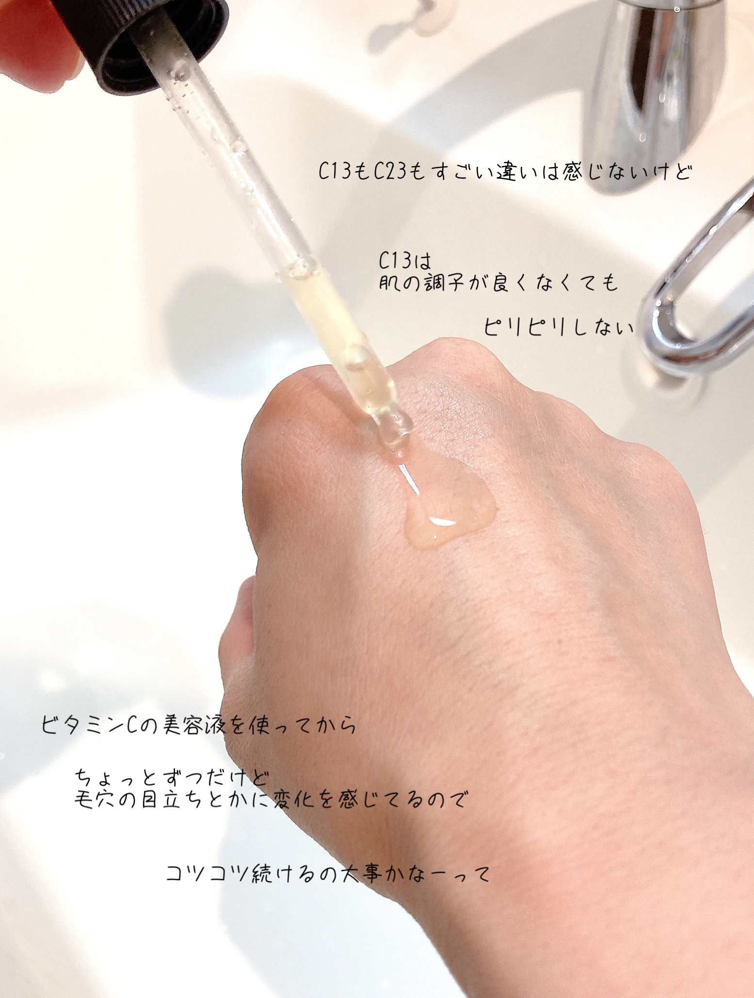 - <20ml> 精製水、アスコルビン酸 (13%)、BG、ジプロピレングリコール、トロメタミン、アスコルビルエチル、パンテノール、アセチルグルコサミン、カフェイン、ヒアルロン酸ナトリウム、亜硫酸ナトリウム、EDTA-2Na、グルタチオン、アデノシン、クチナシ果実エキス、アラントイン、デキストリン、スクワラン、トコトリエノール、トコフェロール、パーム油、アルギニン、ナイアシンアミド、ペンチレングリコール、カンゾウ根エキス