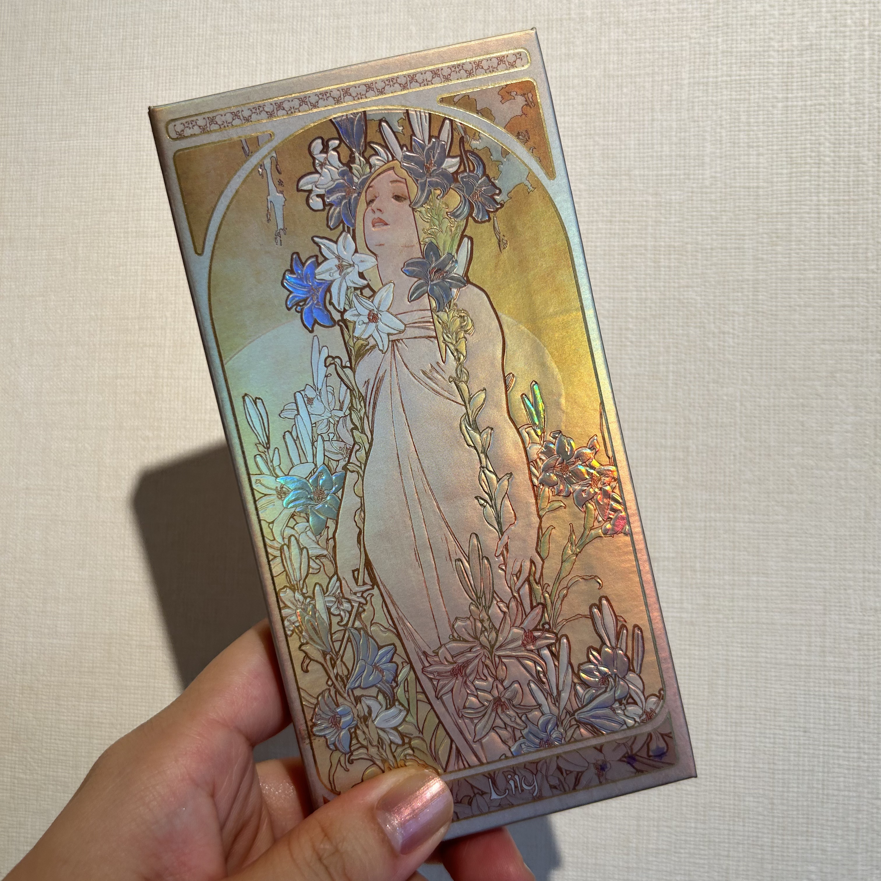 圧倒的に美しいパケ あのアルフォンス・ミュシャの絵画がパケにあしらわれ、しかも輝くような加工がされていてメイクに使うたびに心が躍る💓 ただのアイシャドウというわけじゃなくてマルチパレットなのもポイント高い🔥 これ一つで☑️アイシャドウ☑️チーク☑️シェーディング☑️ハイライトの4役をこなしてくれるから、旅行はこれ一つ持ってけばほとんどカバーできる。 この便利さ、ズボラ人間には優しすぎる。