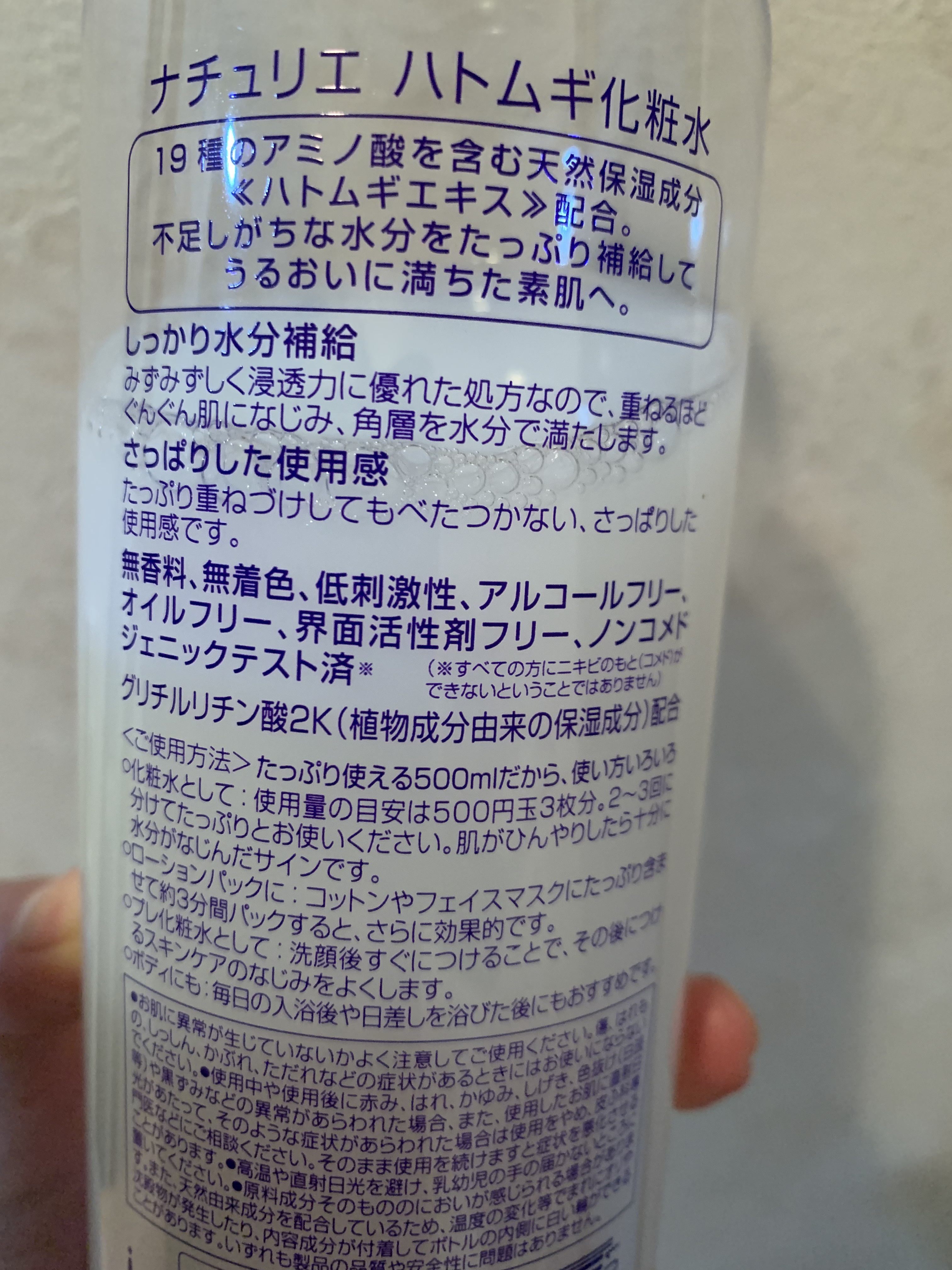 - <通常サイズ 500ml> 水、DPG、BG、グリセリン、ハトムギエキス、グリチルリチン酸2K、(スチレン/VP)コポリマー、クエン酸、クエン酸Na、メチルパラベン <500ml+ 限定ムーミンデザインボトル> 水、DPG、BG、グリセリン、ハトムギエキス、グリチルリチン酸2K、(スチレン/VP)コポリマー、クエン酸、クエン酸Na、メチルパラベン <詰め替えタイプ 480ml> 水、DPG、BG、グリセリン、ハトムギエキス、グリチルリチン酸2K、(スチレン/VP)コポリマー、クエン酸、クエン酸Na、メチルパラベン <旧製品> BG、グリセリン、メチルパラベン、エタノール、グリチルリチン酸2K、ハトムギエキス、DPG、クエン酸Na、プロピルパラベン、クエン酸、(スチレン/アクリレーツ)コポリマー、水 <限定ムーミンデザイン> 水、DPG、BG、グリセリン、ハトムギエキス、グリチルリチン酸2K、(スチレン/VP)コポリマー、クエン酸、クエン酸Na、メチルパラベン