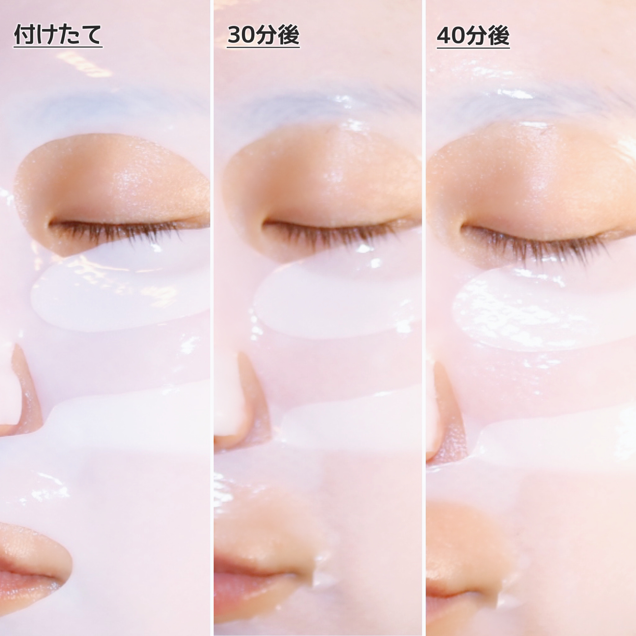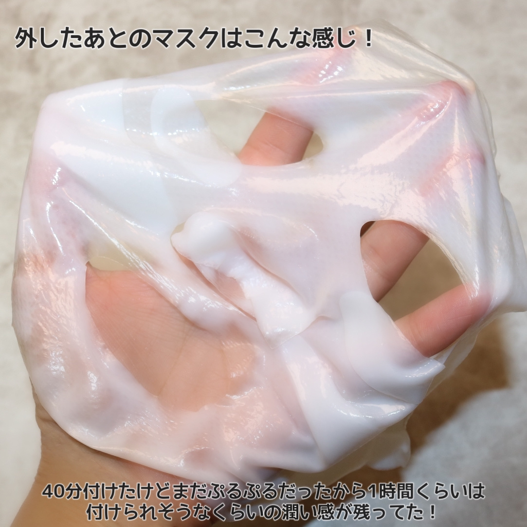 20〜40分しっかりとつける、ぷるんぷるんのマスクパック! マスクの美容成分が吸収されると透明に変わっていく✨ 長時間つけていてもズレにくく、密着力もまぁまぁ◎ 私の顔の形のせいなのか、頬やおでこにはピタッとついたけど、鼻や眉間はどうしても浮いちゃって、シートがなかなか透明にならなかった💦 ベタつきもなく、使用後はぷるんとした感じがあってスペシャルケアにいいかな💕