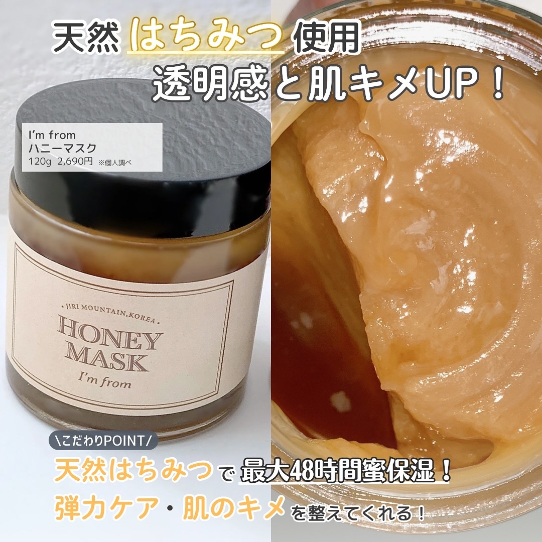 I'mfromハニーマスク/フィグスクラブマスク韓国発の自然派スキンケアブランド「I'mfrom」の人気フェイスマスク!ハニーマスクは天然ハチミツをたっぷり配合。濃厚なハチミツの香りとねっとりしたテクスチャーが特徴で、まるで本物のハチミツを塗...