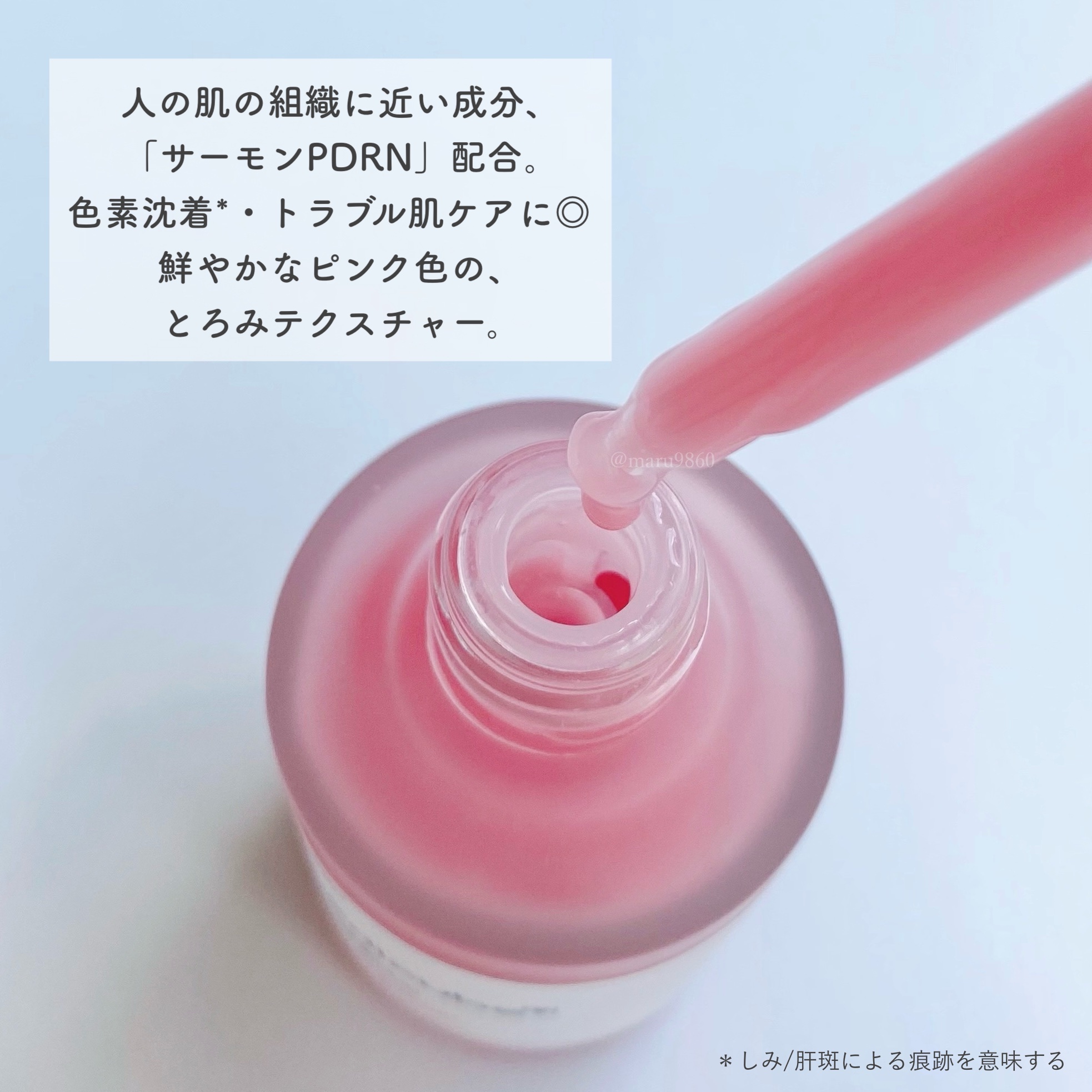 - 韓国の美容の専門機関からのアイデアを得て、サーモン由来成分PDRN(*1)と5種のペプチド(*1)成分を配合したピンク色の美容液です。 PDRN成分は肌のくすみ(*2)など、整肌ケアにおすすめの話題の美容液です。 5種のペプチド(*1)成分は、乾燥などの外部の刺激でゆらぎがちな肌のバリア機能をサポートして、肌を健やかに保ちます。 *1. 整肌・保湿成分 *2. 古い角質、汚れによるもの