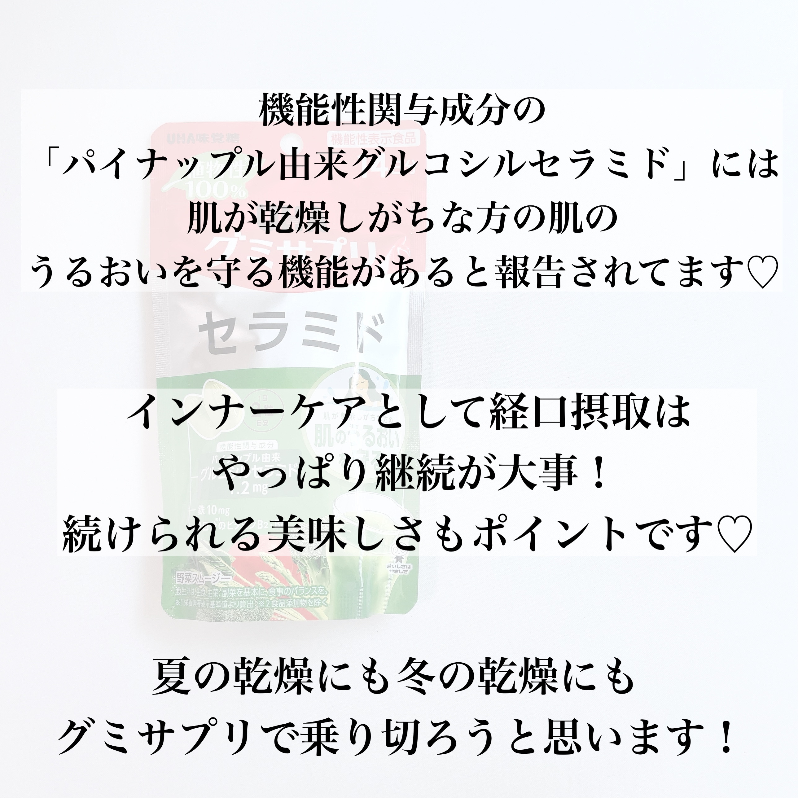 UHA味覚糖「UHAグミサプリ機能性表示食品セラミド野菜スムージー味14日分」¥1,296(税込)前回の「やさいにプラス」に続き2種類目のレビューです😊グミなのだけど弾力はそれほどなく、サクッと歯が通る感じ。面白い!味覚糖さんのグミサプリって...