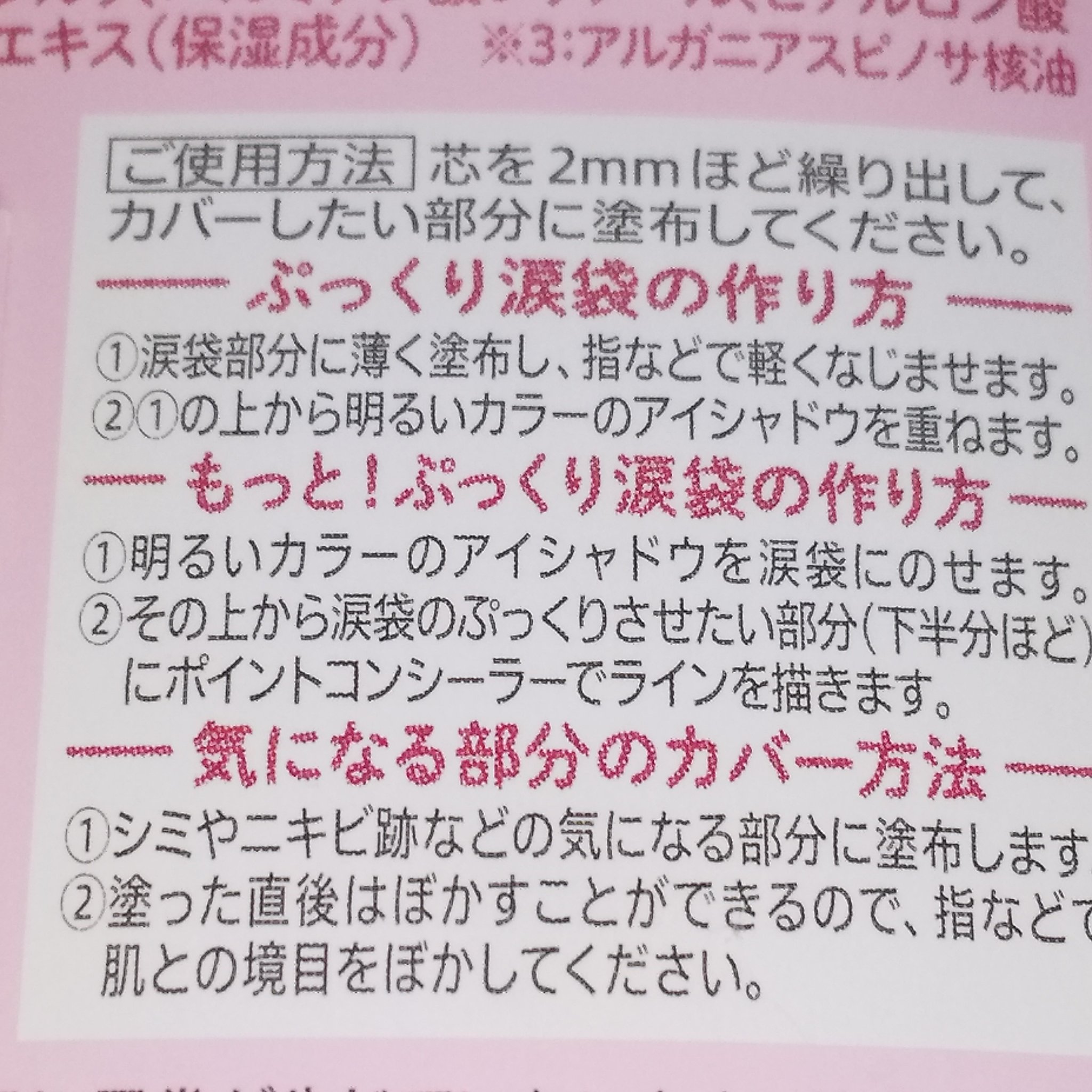 - ぷっくり涙袋も作れる ペンシルタイプのコンシーラー ●ピンポイントで描けるコンシーラー 直径3mmの細芯採用で、描きたい場所にピンポイントで描けます。 ●ウォータープルーフ+長時間くずれにくいラスティング処方 油性の揮発成分※1と皮膜剤※2を配合。塗布後に皮膜が形成されるので、汗や涙、こすれにも強いコンシーラー。 ※1 シクロペンタシロキサン ※2 トリメチルシロキシケイ酸 ●やわらか芯でスルスルなめらかに描ける 限界まで芯のやわらかさを追求。目元にもスルスル描けるペンシルコンシーラーを実現しました。