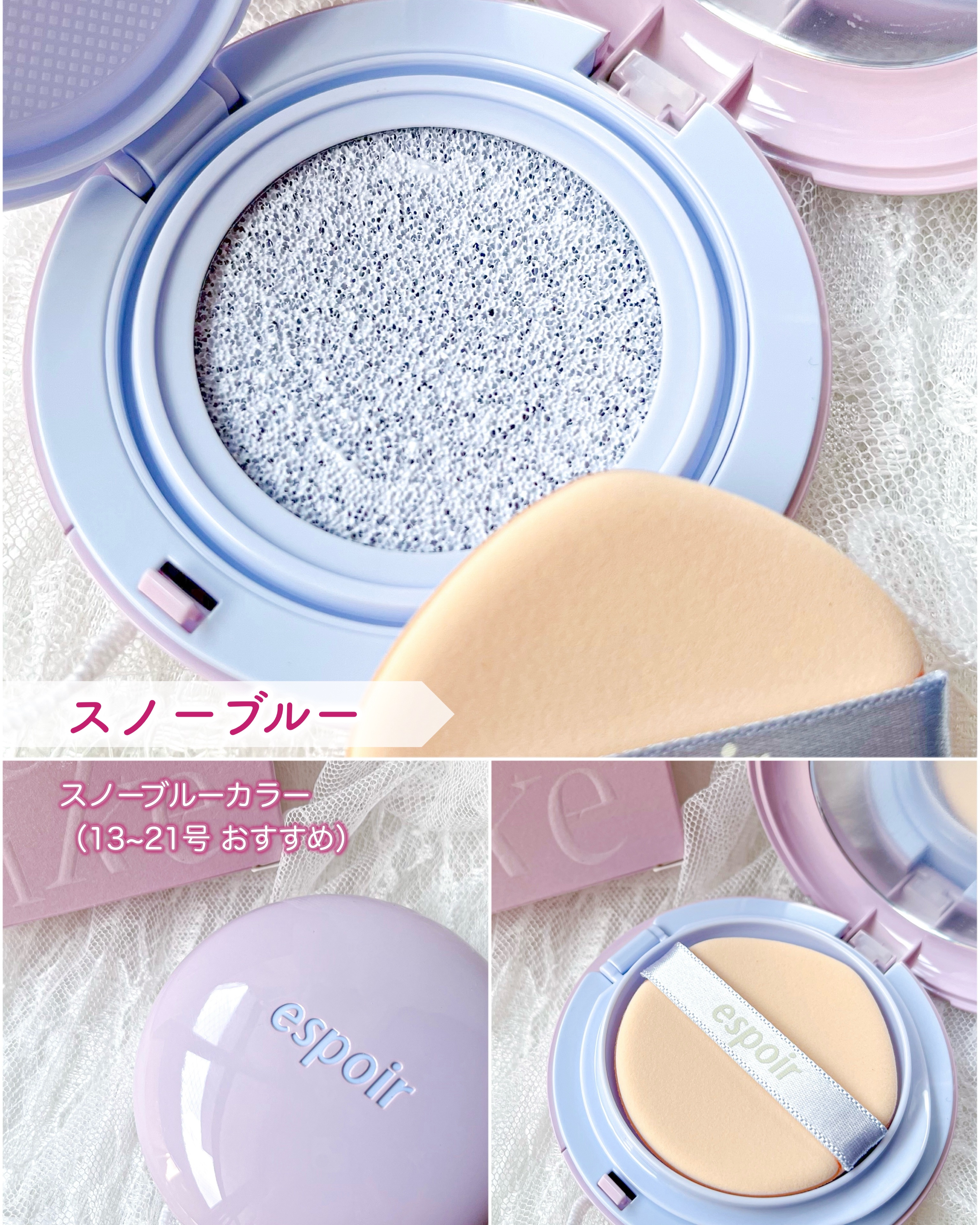 ゼリーのようにぷるんと水光肌へ🩵 今回はespoirのトーンアップクッション!ファンデの前に塗ることで肌のトーンアップをし透明感のあるみずみずしい肌へと✨️ 私が今回使用したのは【スノーブルー】🩵 反射板を当てたようにくすんだ肌をトーンアップして透明感のある肌へ 高保湿ヒアルロン酸とセラミド配合で乾燥せずしっとり一日中快適な肌へ