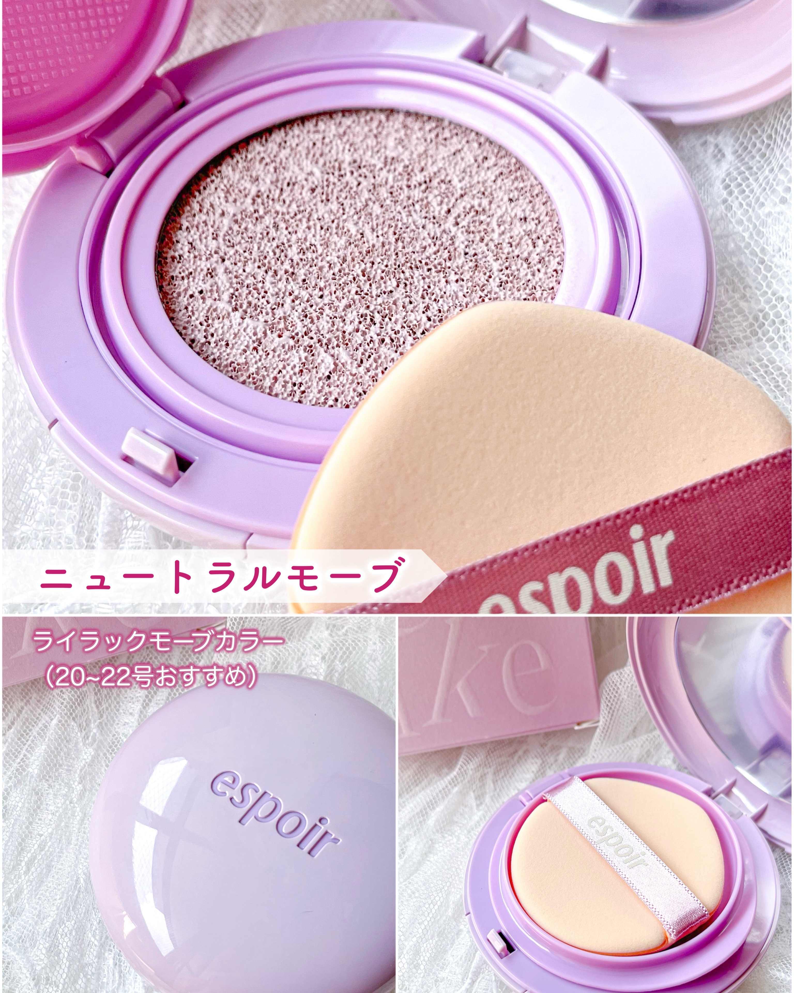 - ゼリーのような弾力のある肌へ導くトーンアップクッション。 SPF50+ PA+++で日焼け止め機能もある万能ベースメイク。 <ヌーディーピーチ> ヌーディーピーチカラーはベージュの色味で、自分の肌のような自然なトーンアップを演出します。 <ニュートラルモーブ> ニュートラルモーブカラーは黄ぐすみカバーをしてくれるので、パッと華やかな印象に。どんな肌の色の方でも綺麗にトーンアップします。 <スノーブルー> スノーブルーカラーはくすみを補正し透明感がアップします。