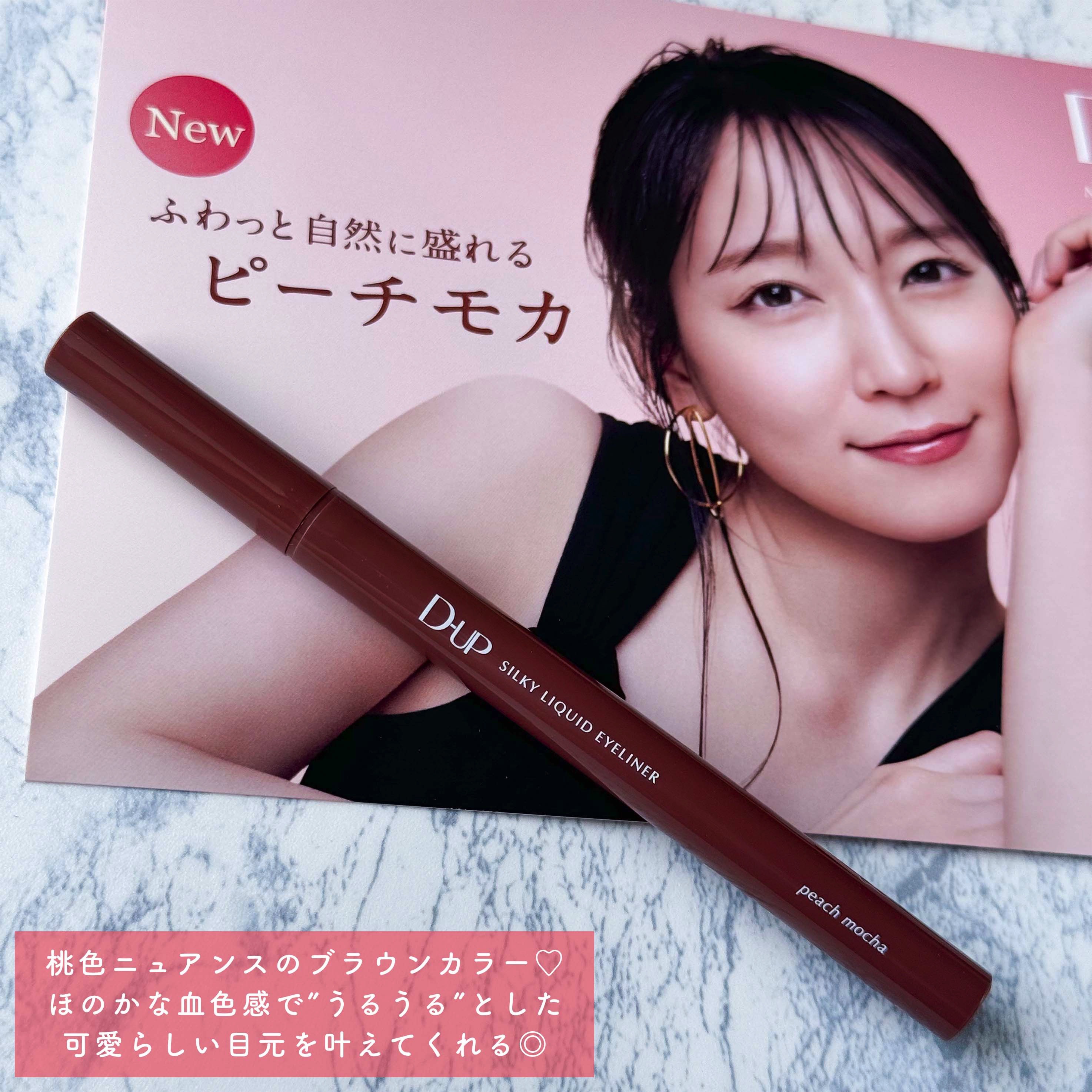 ナチュラルに盛れるピーチモカ🍑🤎 桃色ニュアンスのブラウンがめっちゃ可愛い😍 自然に目幅が拡張して見えるのがお気に入り🤎 しかもほんのり血色がうるみ感も演出してくれます。 D-UPシルキーリキッドアイライナーWPは全色持っていますが、その中でもかなり好きなカラーです🩷