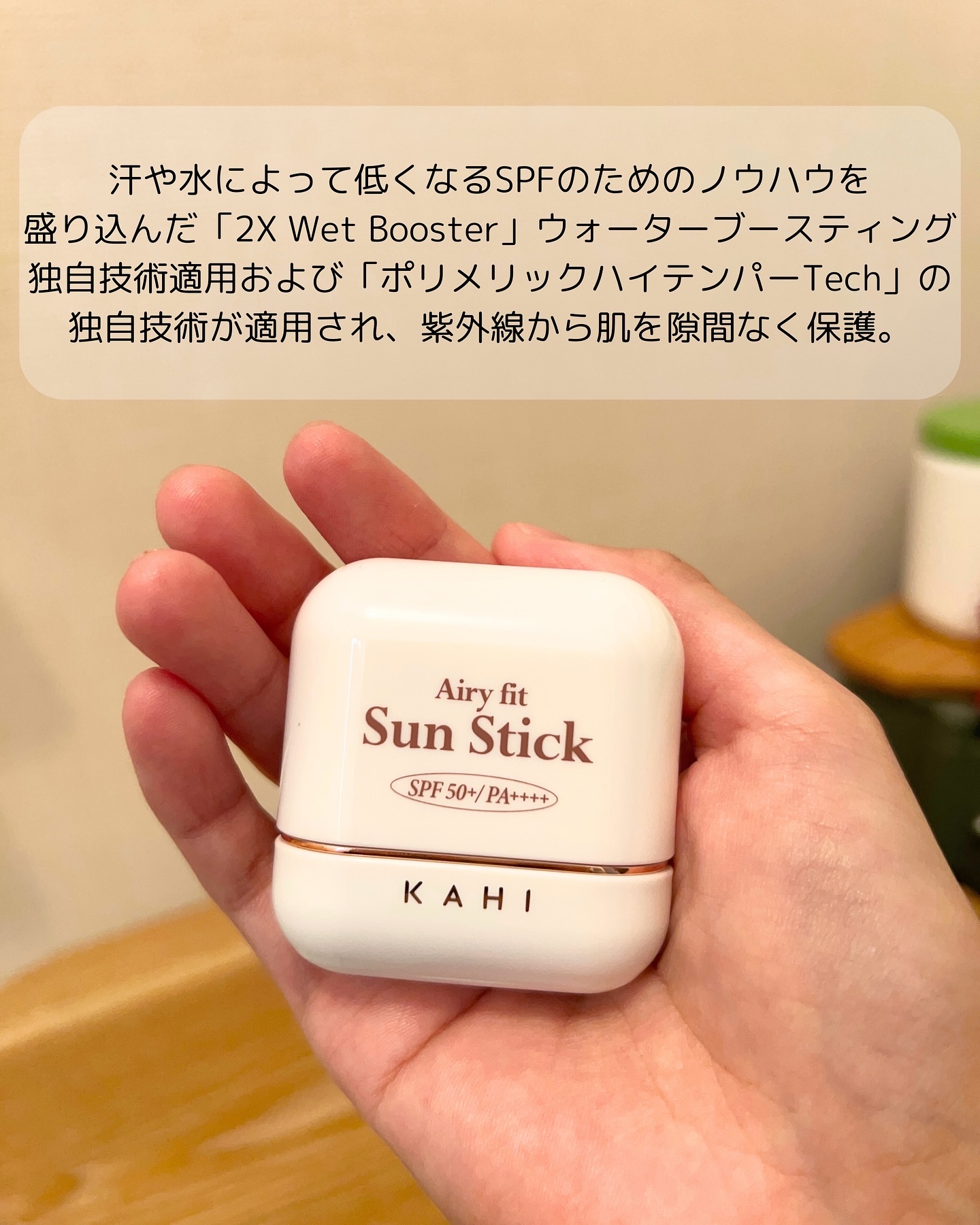 - ベタつきやテカりがなく、サラッとしたエアリーなテクスチャー。 手を汚さずに直接塗れて、メイクの上から塗り直しが可能です。 水や汗はもちろん、砂がついてもサラサラだから、レジャーシーンでも大活躍すること間違いなし。 空気のような軽さで密着し、べたつかずサラサラの肌に。 独自開発のウォーターブースティング技術を採用、長時間UVケアを叶える日焼け止めスティック。 #エアリーフィット #持ち運びサイズ #いつでもどこでも #メイクの上にもさらっと密着 ☑SPF50+、PA++++ ☑3種のプルーフ: ①水に強いウォータープルーフ ②サラサラで砂が付きにくいサンドプルーフ ③汗や皮脂で落ちにくいスウェットプルーフ ☑2つの独自開発技術採用 ①ウォーターブースティング技術:汗や水分に反応してSPF効果が高まり、UVケア効果が長持ち。 ②ポリメリックハイテンパー技術:高い気温の中でも、長時間SPF効果を維持します。 ☑さらさら肌を演出: べたつかず肌のテカりを押さえ、重ね塗りをしても肌に負担のない軽い使用感。 パウダーを塗ったようなサラサラ肌に。 ☑いつでもどこでも持ち運びサイズ: 特定のイヤホンケースにぴったりはまるサイズ感。ケースに入れてキーホルダーにように持ち歩いても◎