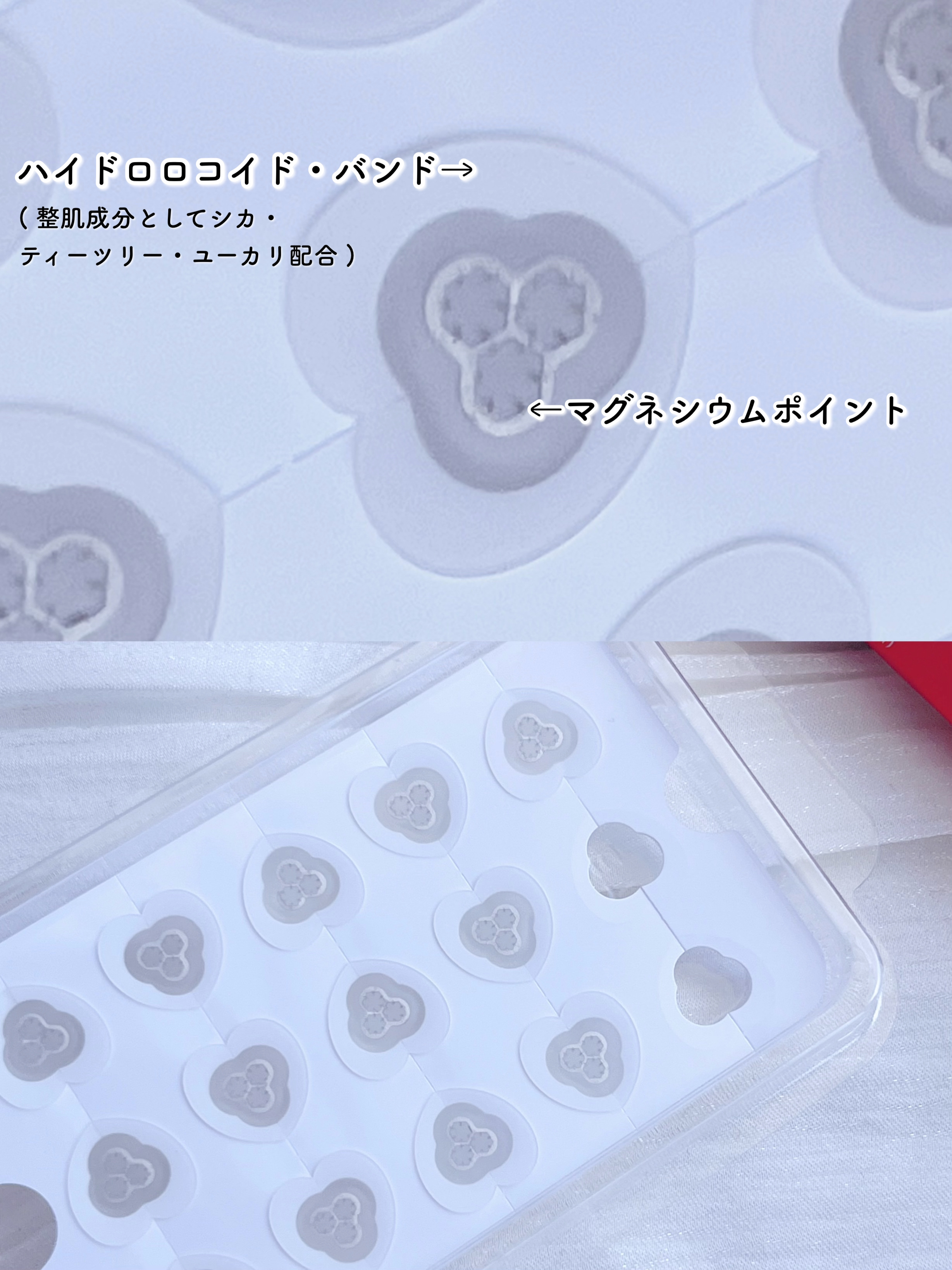 - 肌のバリア機能をサポートするマグネシウムニードル(整肌成分)を使用したパッチで、気になる部分の肌を整えます。マグネシウムは人体必須ミネラルのひとつです。敏感になった肌にもご使用いただけます。