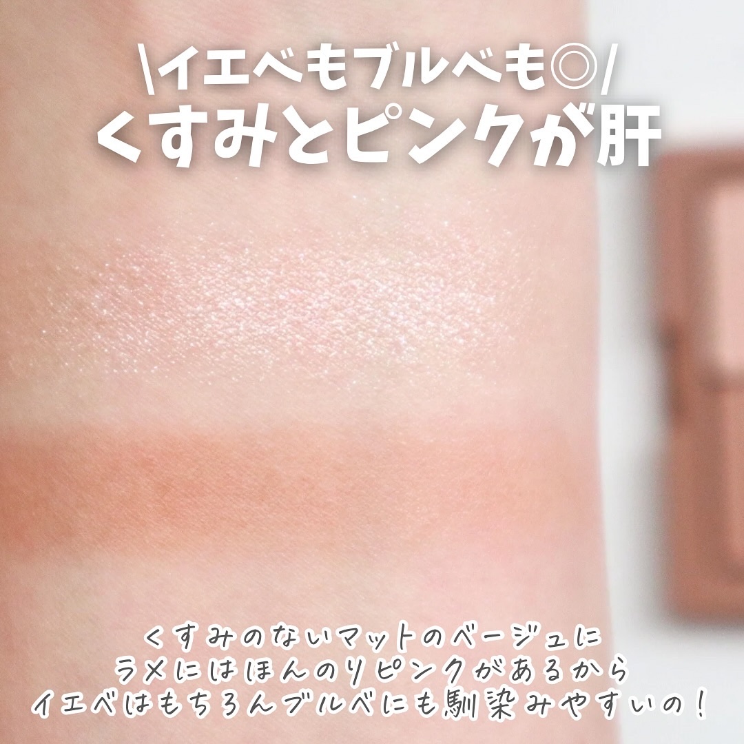 アカリンベスコスのアイシャドウ♡ 使いやすいベージュカラーです。 左のラメはほんのりピンクっぽさがあり、ホワイト・レッドパール配合されていて、華やかな印象に♡ 右は微細パール配合。くすまず、ナチュラルに陰影が付けられる🥨