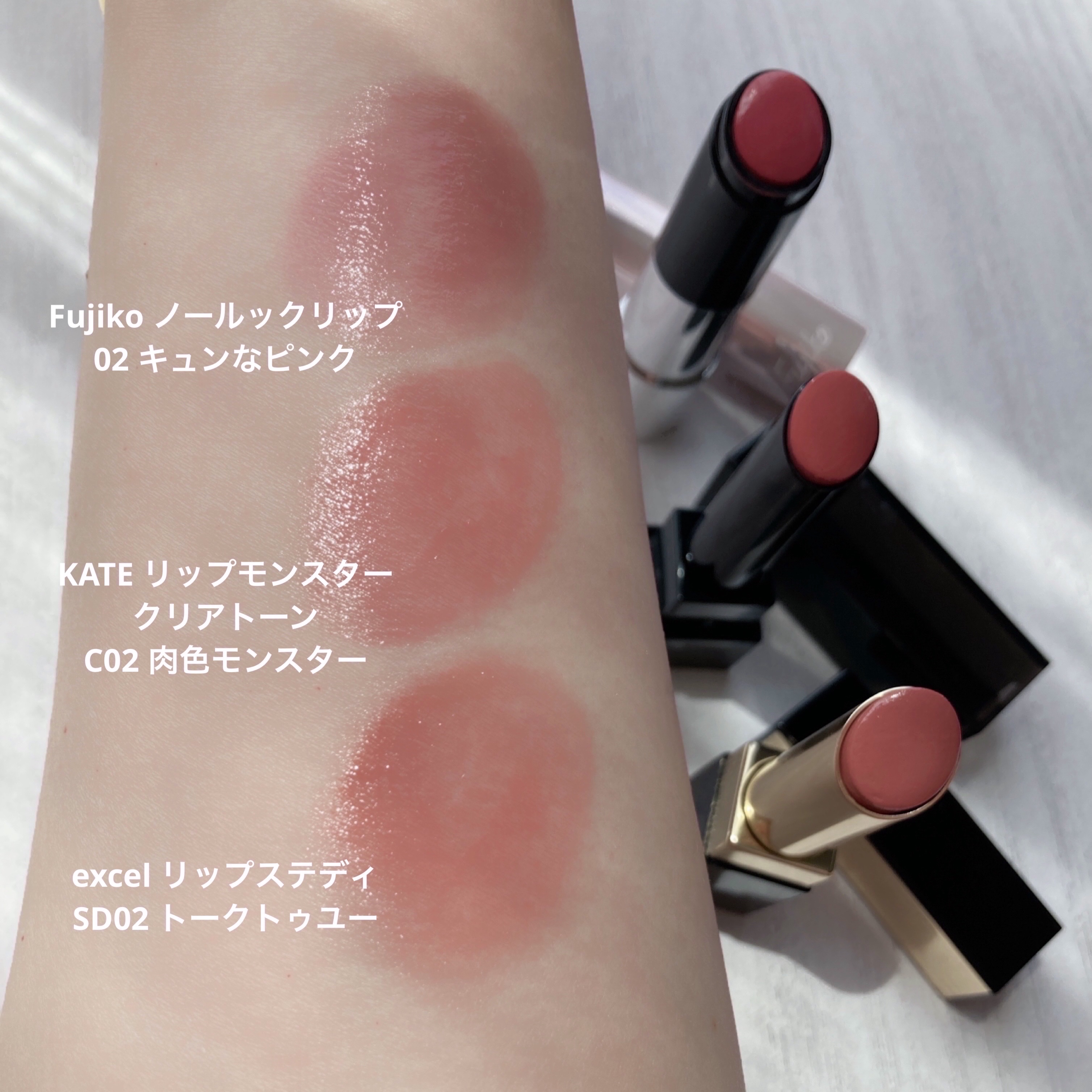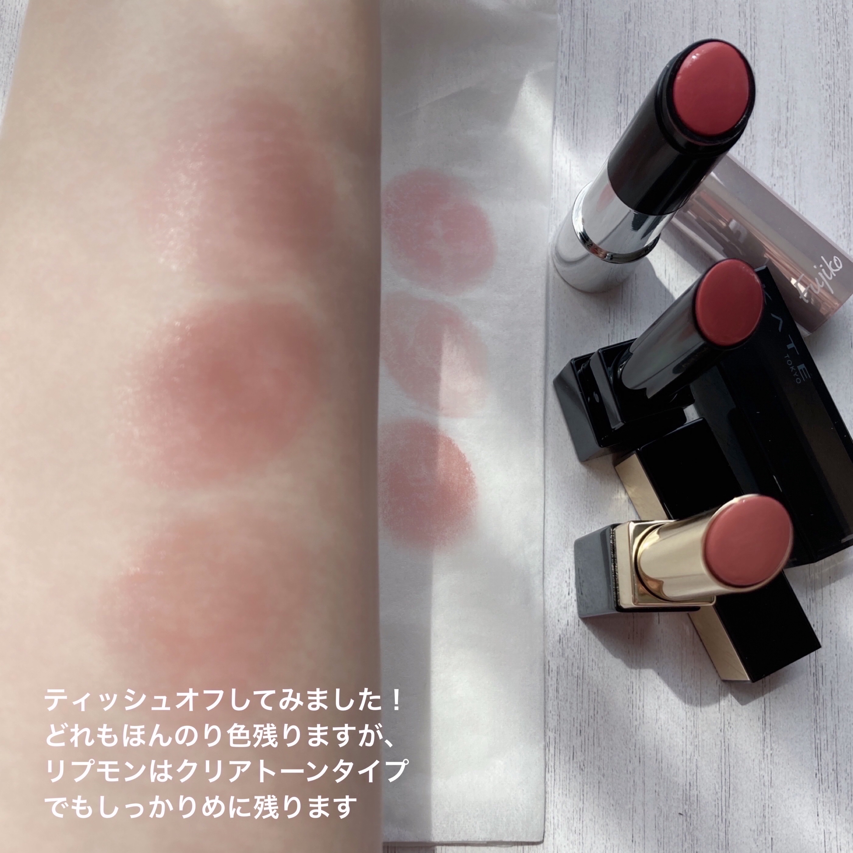 SUQQUはモチモチな塗り心地でむっちりした唇になり、シアーで潤いが続くのに色もちも良いです KANEBOはスルスルとモチモチの中間の塗り心地で色もちが良く、オフしたあとも唇がしっとりする美容液リップです 個人的に好きなのはSUQQU 103は定番色にしてほしい🥺